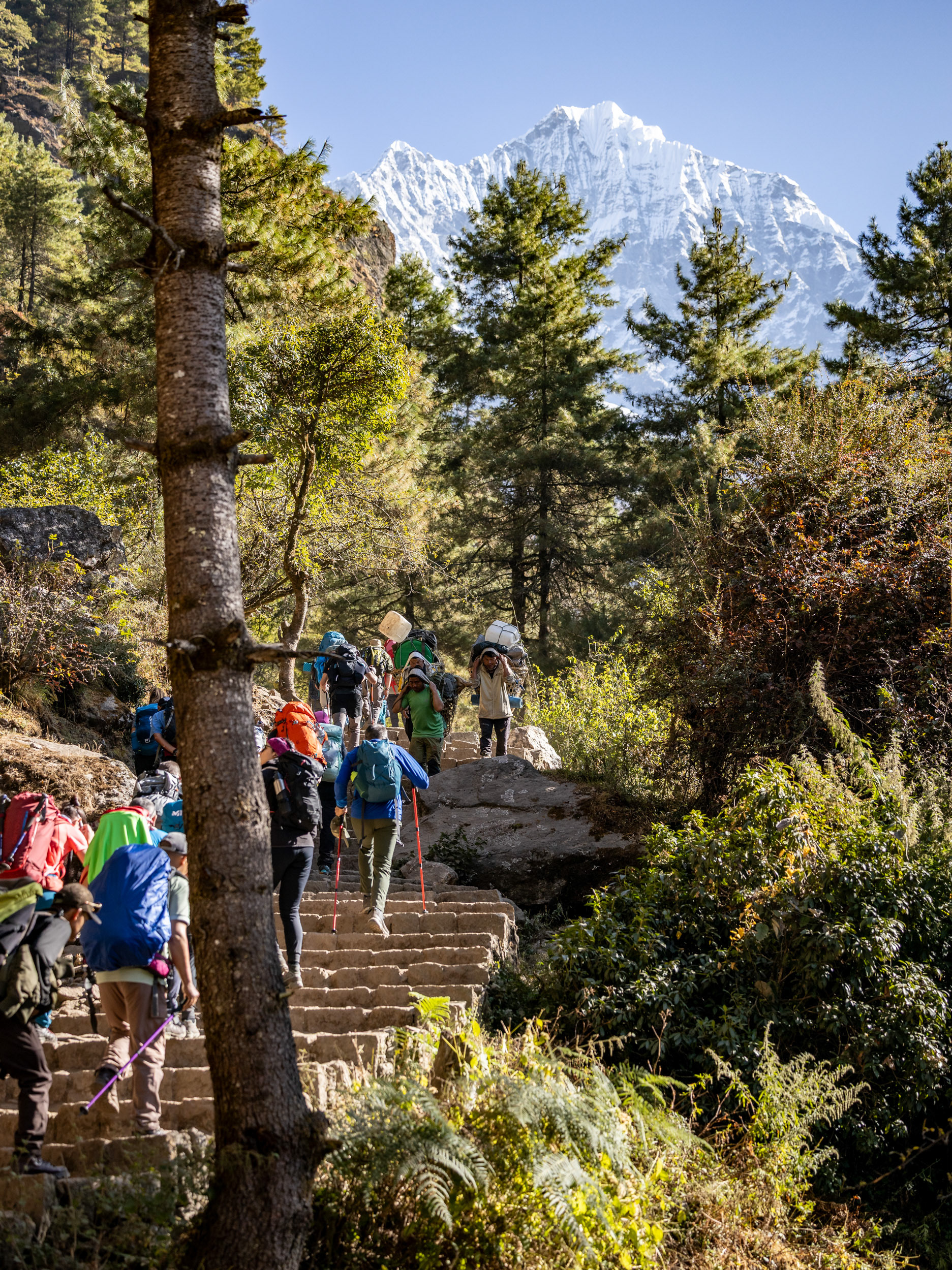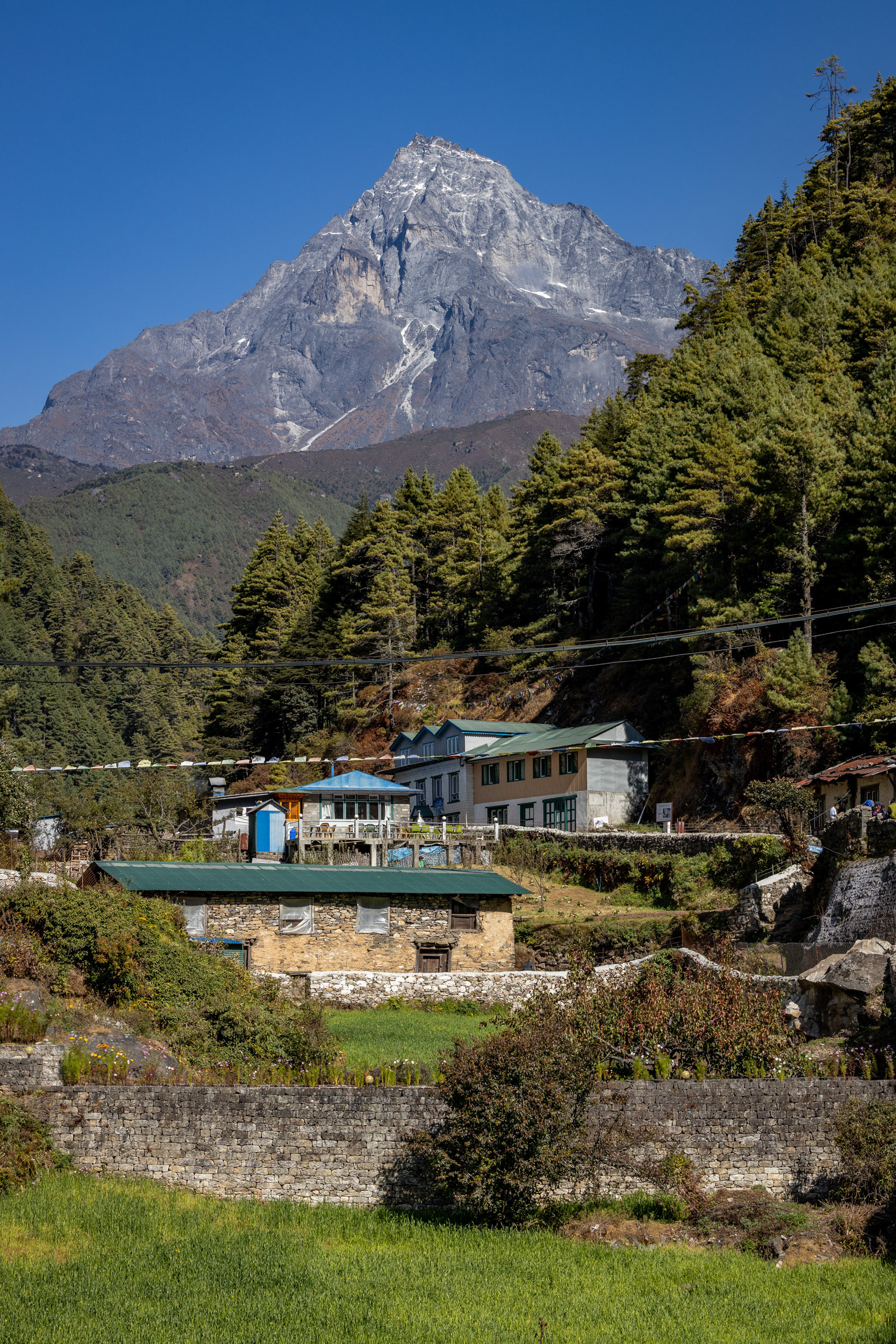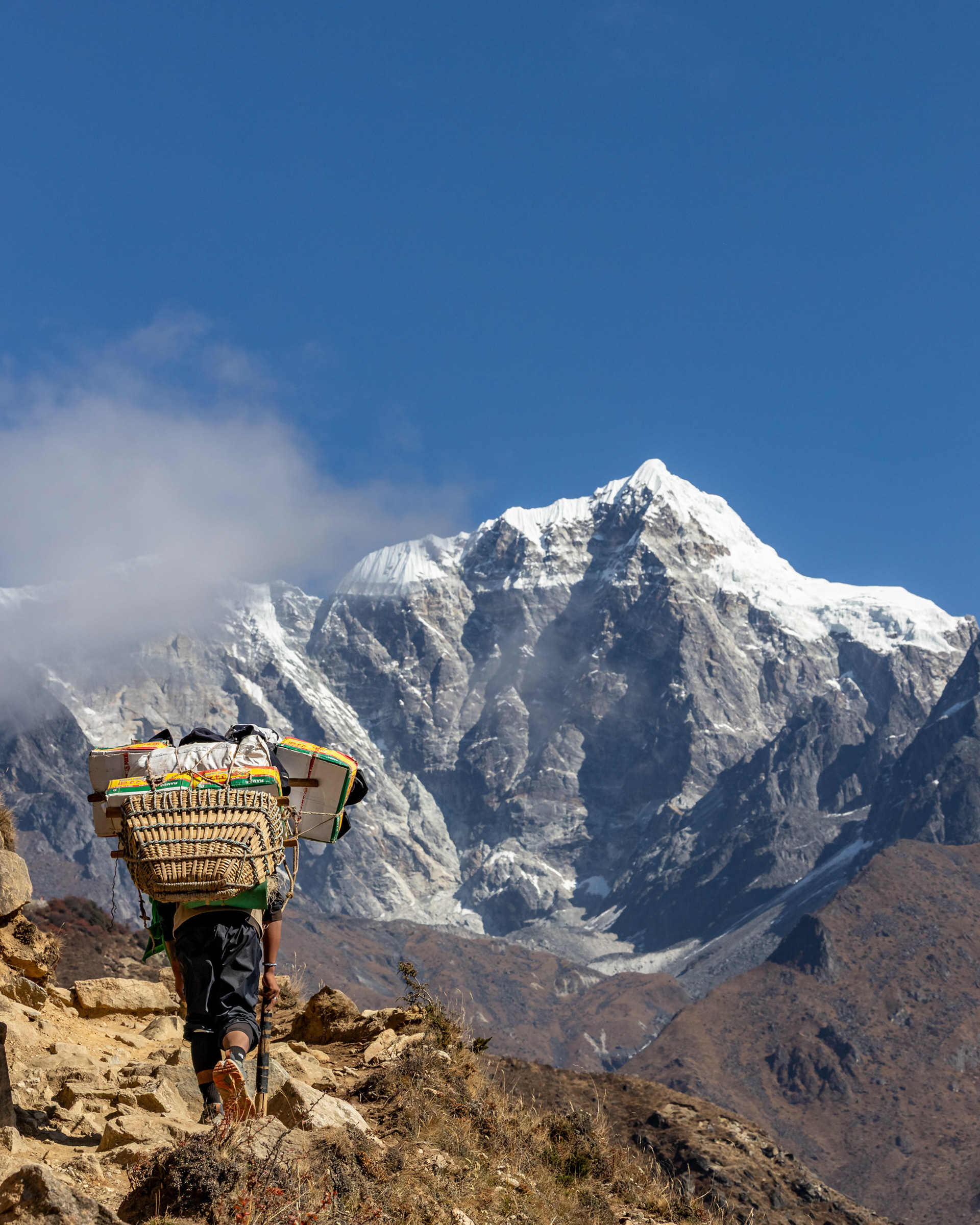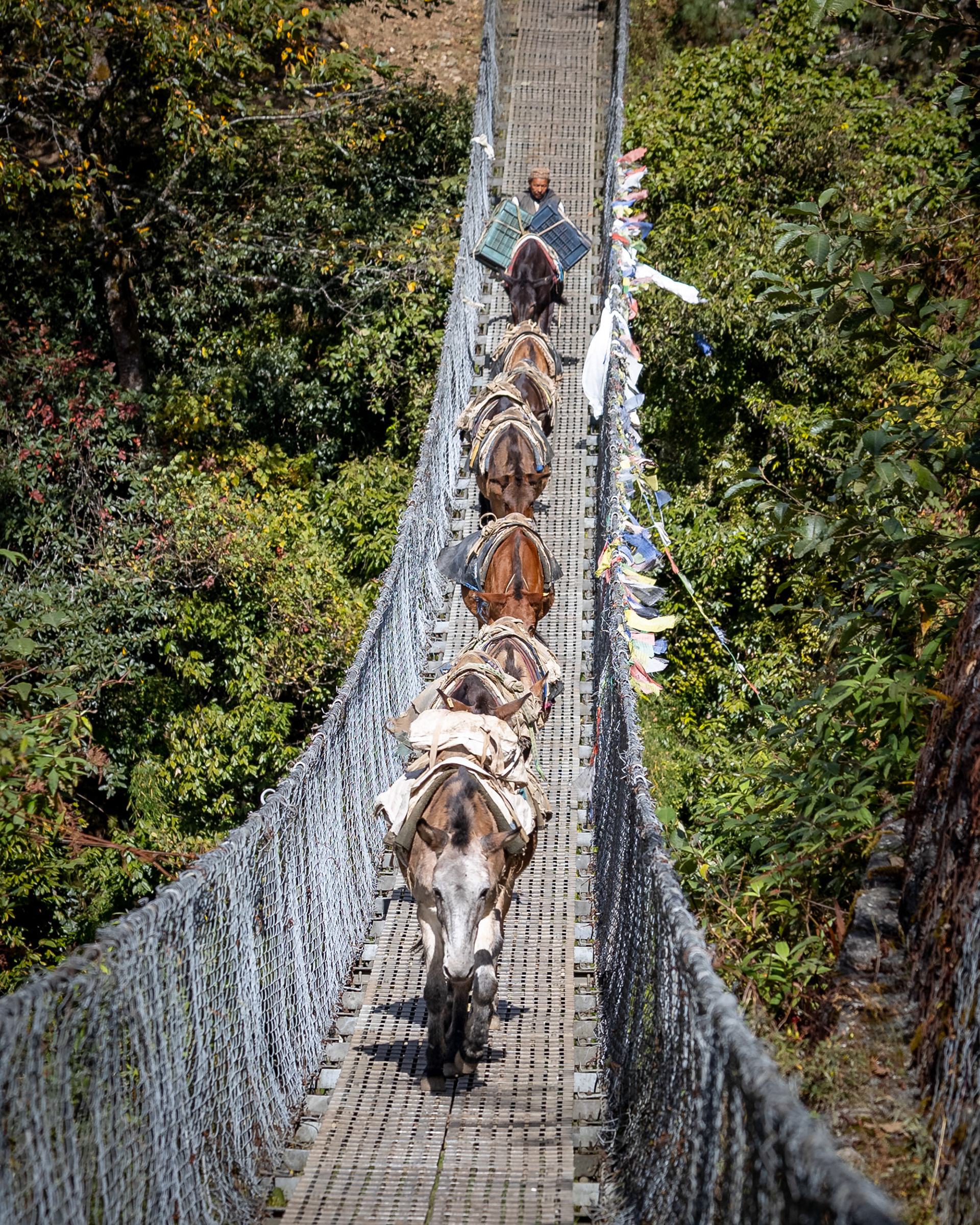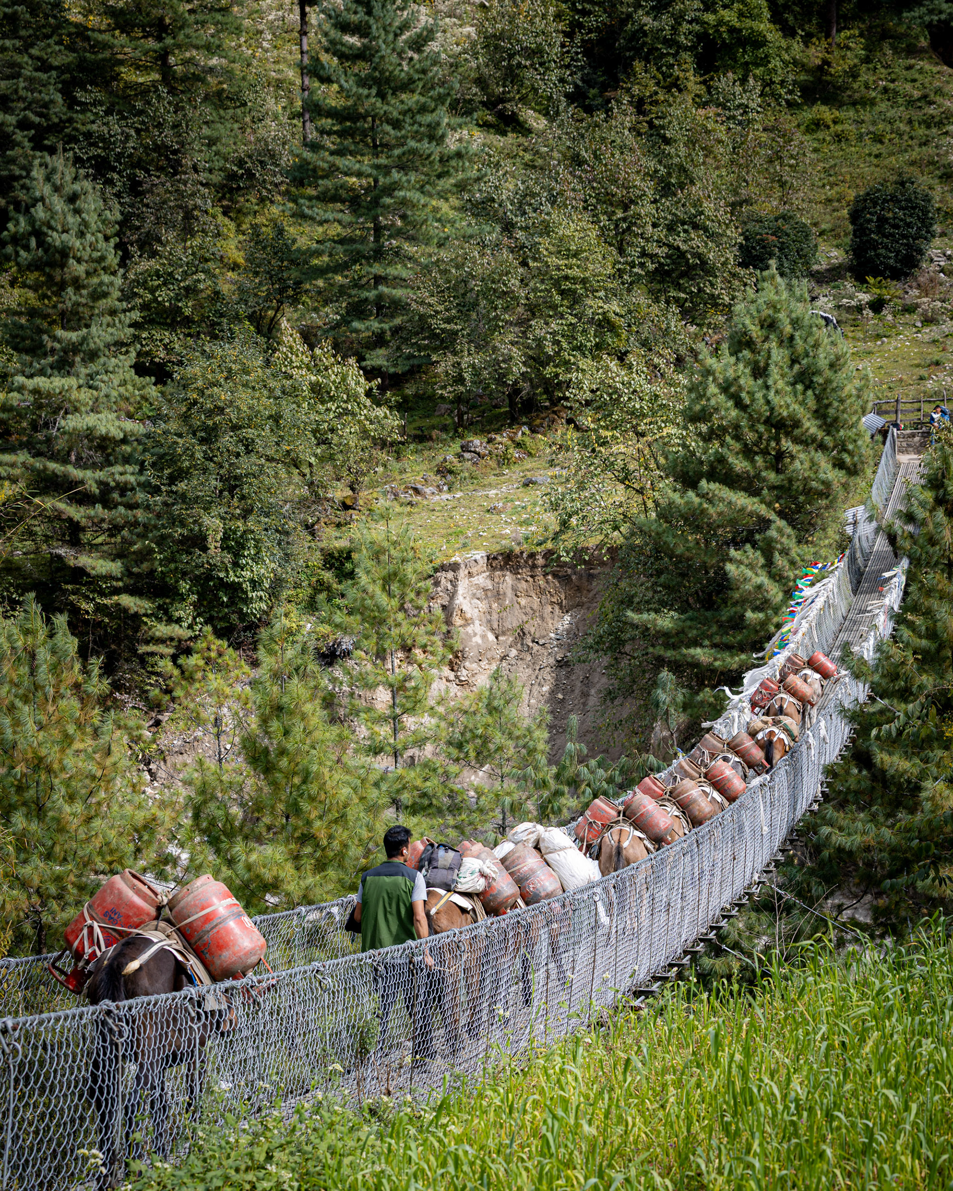Die zweite Etappe nach Namche Bazar (3440m) führt über abenteuerliche Hängebrücken, die 200m tiefe Schluchten überspannen, durch niedliche Dörfer und Flusstäler, die an Szenen aus King Kong erinnern. Während die Vegetation noch eher der in den Alpen gleicht, wirkt das Bevölkern der Täler und die Logistik dahinter wie eine Meisterleistung. Wer dabei unbedingt erwähnt werden sollte: Die Träger der Sherpas, die auch unser zusätzliches Gepäck während des gesamten Treks tragen. Ohne sie wäre dieses Vorhaben für uns unmöglich. Der scherzhafte Versuch, kurz die Last selbst zu übernehmen endet nach 10 Höhenmetern in Atemnot - wir übergeben schnell wieder an den Meister, der in zügigem Gange davon sprintet. Ein geübter Träger kann bis zu 90kg auf seinen Rücken packen - von der Kanalisation bis zum Parkettboden wird so manches über die Höhenwege tief in die Berge manövriert. Während ich mir, schnaufend und auf den Weg fokussiert diese Zeilen ausdenke, sprintet ein lächelnder Träger in seinen Sandalen an mir vorbei - mit unzähligen Ziegelsteinen auf dem Rücken.