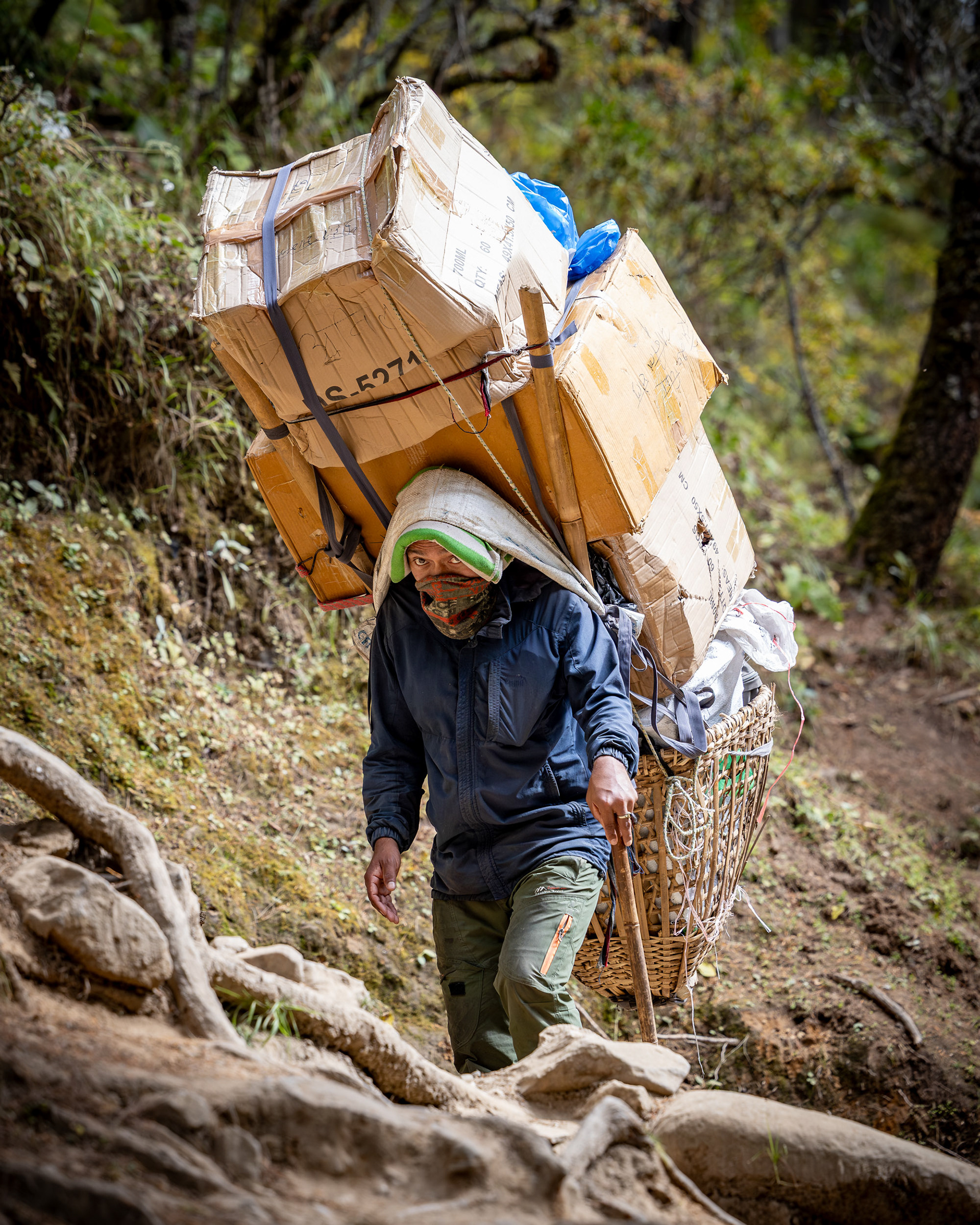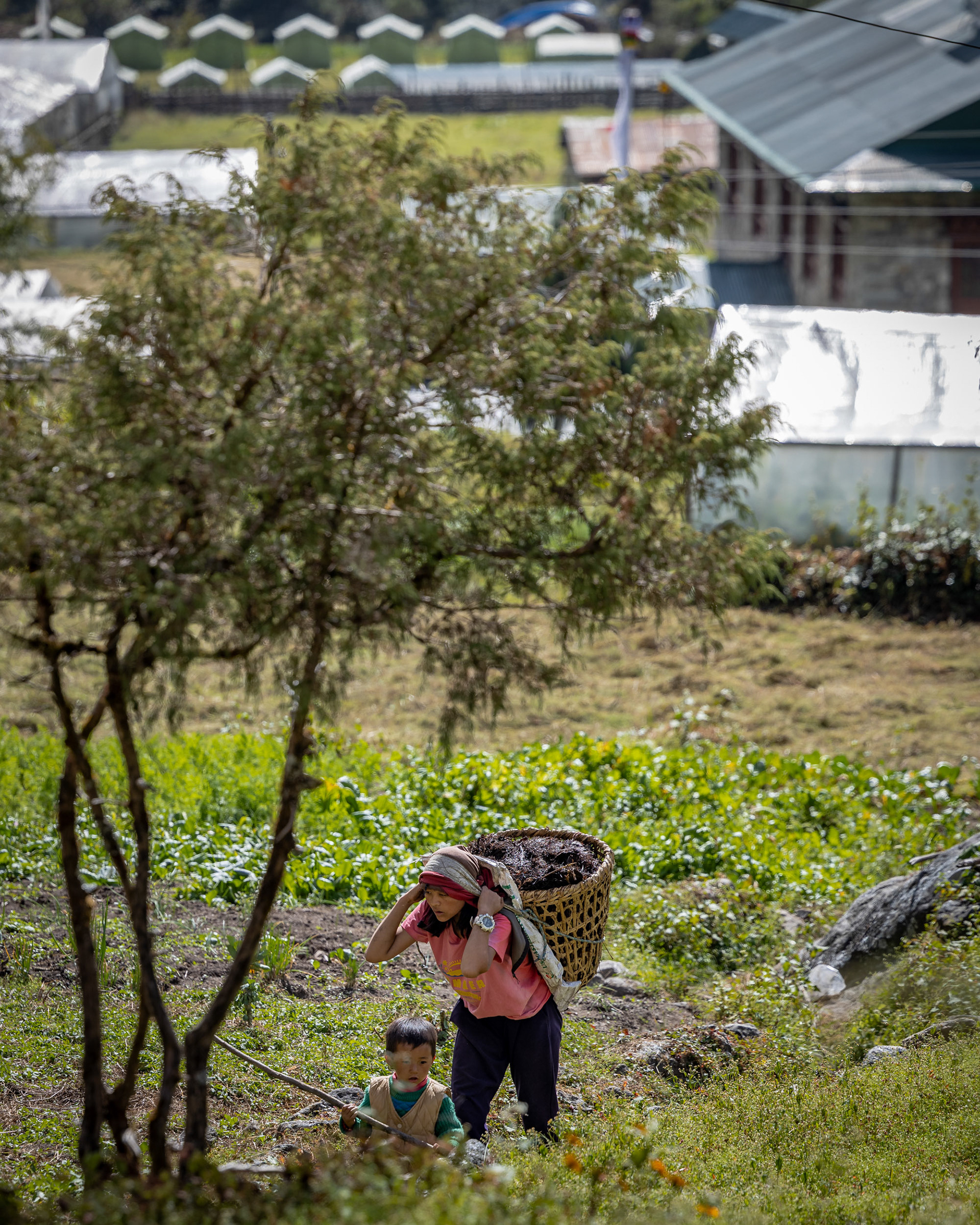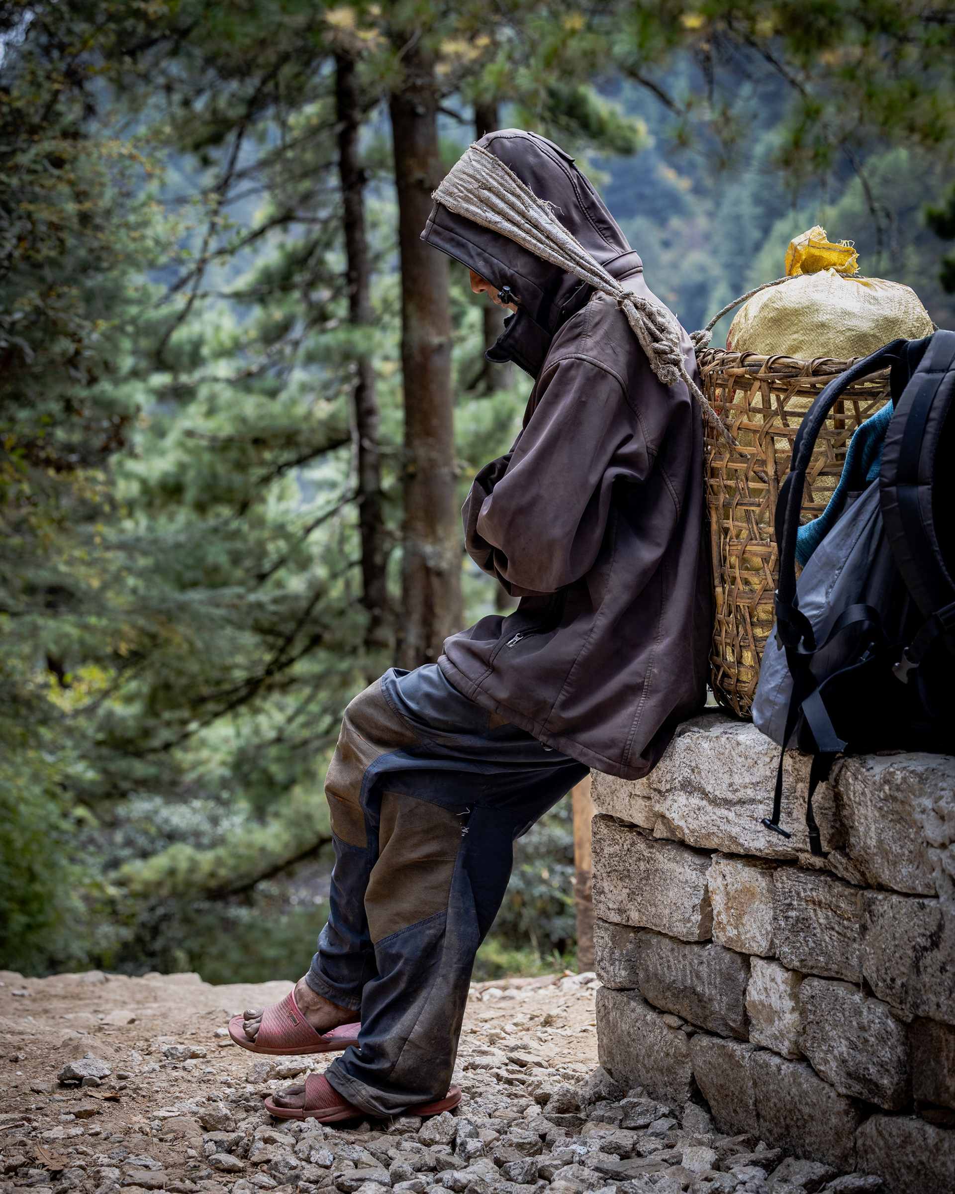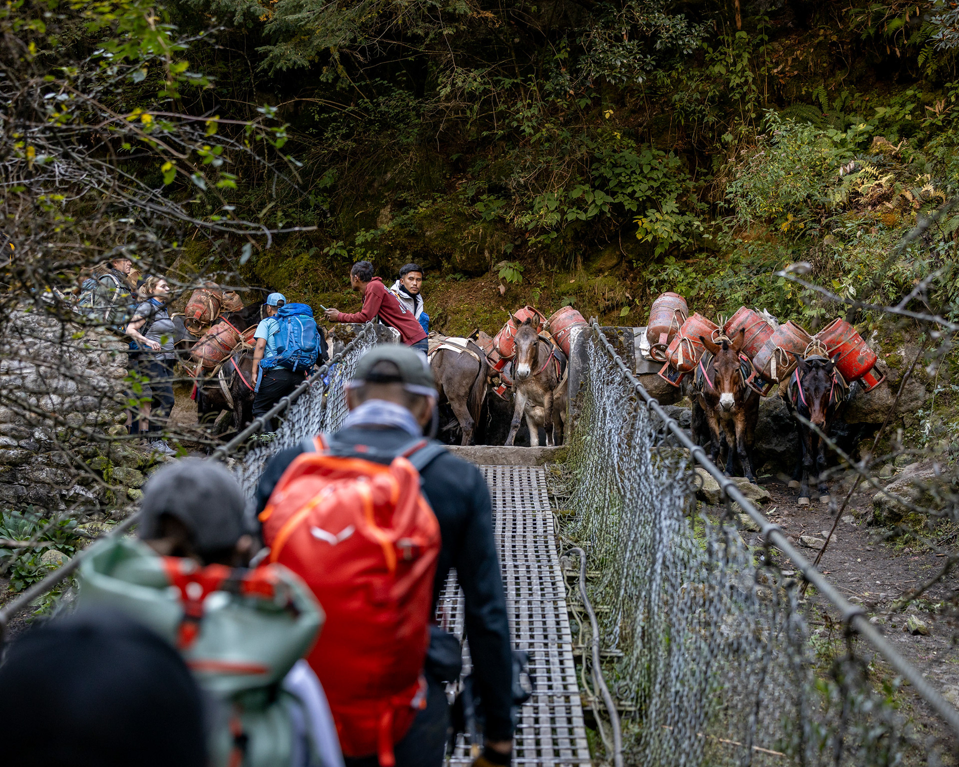 Die zweite Etappe nach Namche Bazar (3440m) führt über abenteuerliche Hängebrücken, die 200m tiefe Schluchten überspannen, durch niedliche Dörfer und Flusstäler, die an Szenen aus King Kong erinnern. Während die Vegetation noch eher der in den Alpen gleicht, wirkt das Bevölkern der Täler und die Logistik dahinter wie eine Meisterleistung. Wer dabei unbedingt erwähnt werden sollte: Die Träger der Sherpas, die auch unser zusätzliches Gepäck während des gesamten Treks tragen. Ohne sie wäre dieses Vorhaben für uns unmöglich. Der scherzhafte Versuch, kurz die Last selbst zu übernehmen endet nach 10 Höhenmetern in Atemnot - wir übergeben schnell wieder an den Meister, der in zügigem Gange davon sprintet. Ein geübter Träger kann bis zu 90kg auf seinen Rücken packen - von der Kanalisation bis zum Parkettboden wird so manches über die Höhenwege tief in die Berge manövriert. Während ich mir, schnaufend und auf den Weg fokussiert diese Zeilen ausdenke, sprintet ein lächelnder Träger in seinen Sandalen an mir vorbei - mit unzähligen Ziegelsteinen auf dem Rücken.