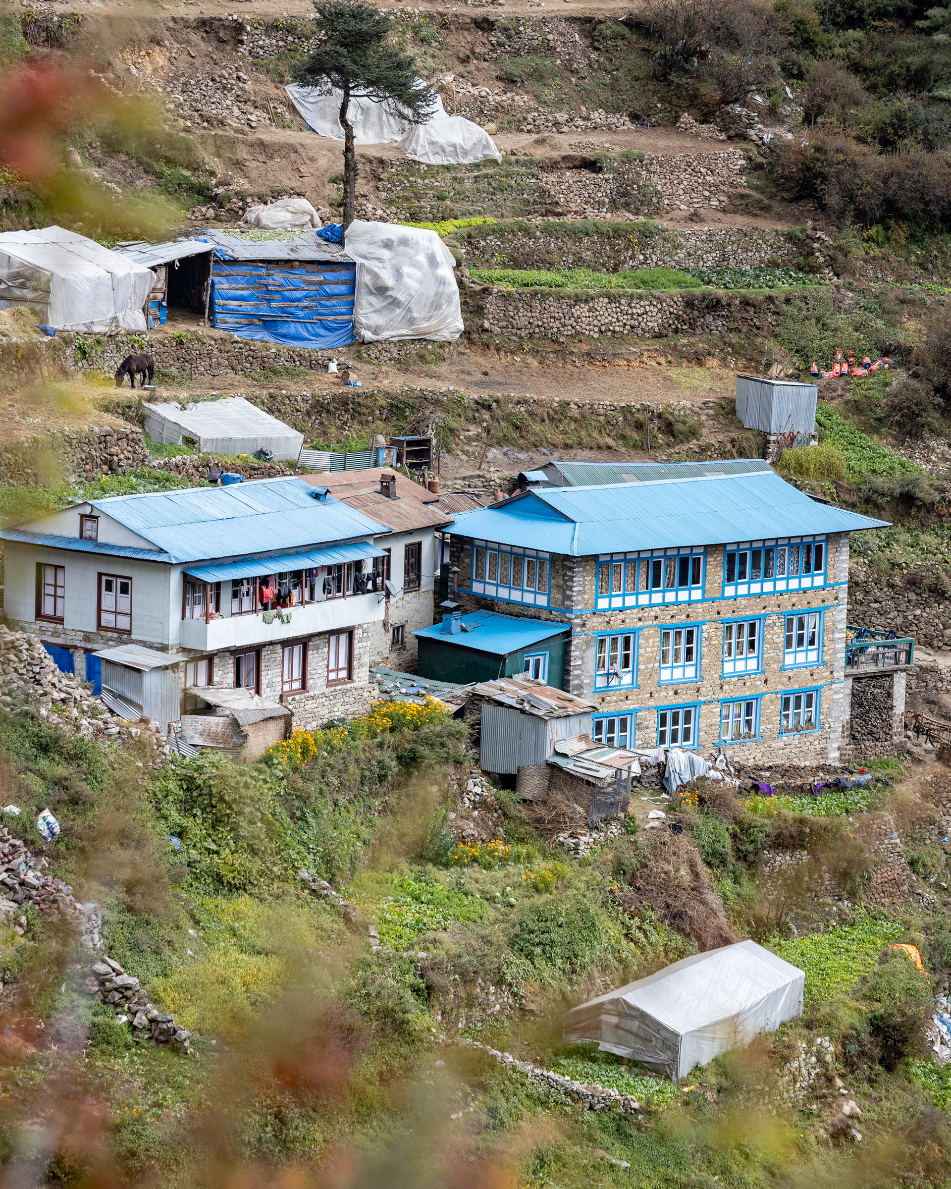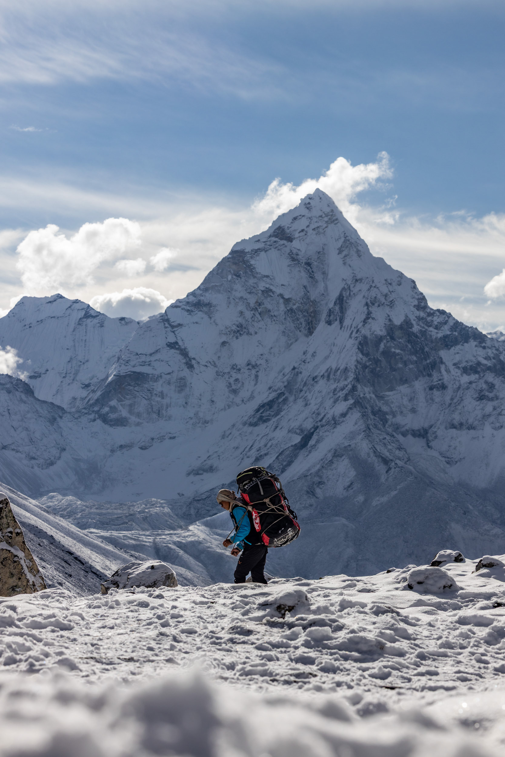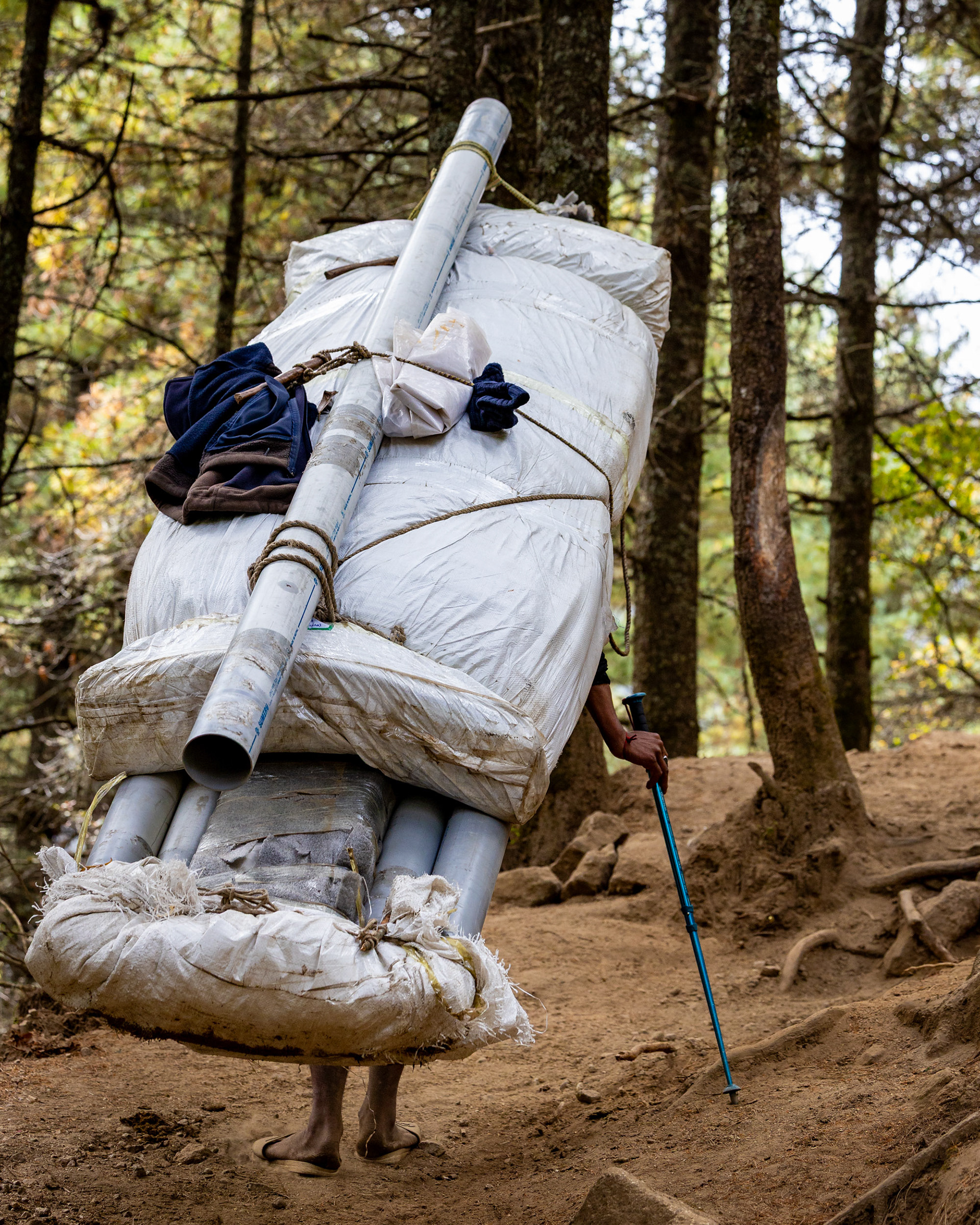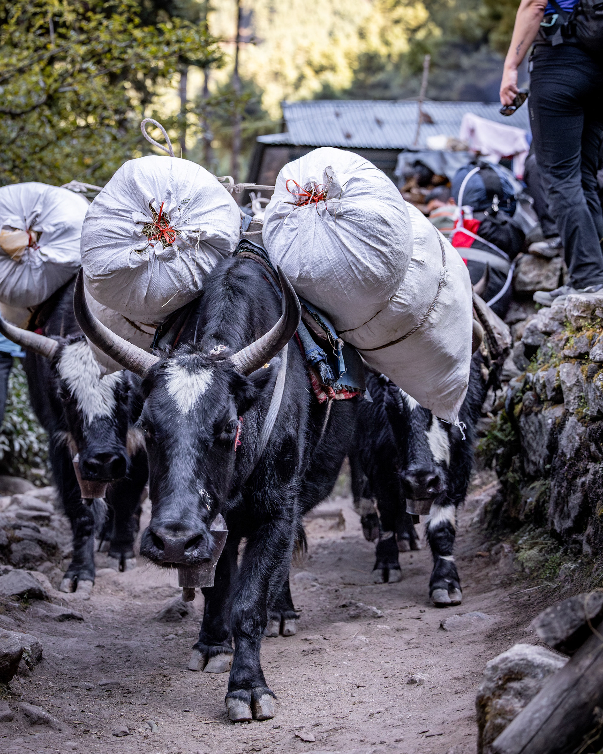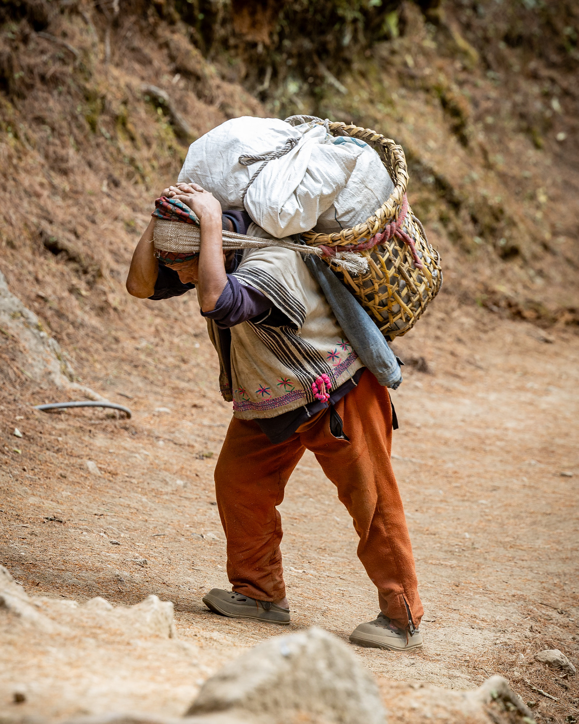 Die zweite Etappe nach Namche Bazar (3440m) führt über abenteuerliche Hängebrücken, die 200m tiefe Schluchten überspannen, durch niedliche Dörfer und Flusstäler, die an Szenen aus King Kong erinnern. Während die Vegetation noch eher der in den Alpen gleicht, wirkt das Bevölkern der Täler und die Logistik dahinter wie eine Meisterleistung. Wer dabei unbedingt erwähnt werden sollte: Die Träger der Sherpas, die auch unser zusätzliches Gepäck während des gesamten Treks tragen. Ohne sie wäre dieses Vorhaben für uns unmöglich. Der scherzhafte Versuch, kurz die Last selbst zu übernehmen endet nach 10 Höhenmetern in Atemnot - wir übergeben schnell wieder an den Meister, der in zügigem Gange davon sprintet. Ein geübter Träger kann bis zu 90kg auf seinen Rücken packen - von der Kanalisation bis zum Parkettboden wird so manches über die Höhenwege tief in die Berge manövriert. Während ich mir, schnaufend und auf den Weg fokussiert diese Zeilen ausdenke, sprintet ein lächelnder Träger in seinen Sandalen an mir vorbei - mit unzähligen Ziegelsteinen auf dem Rücken.