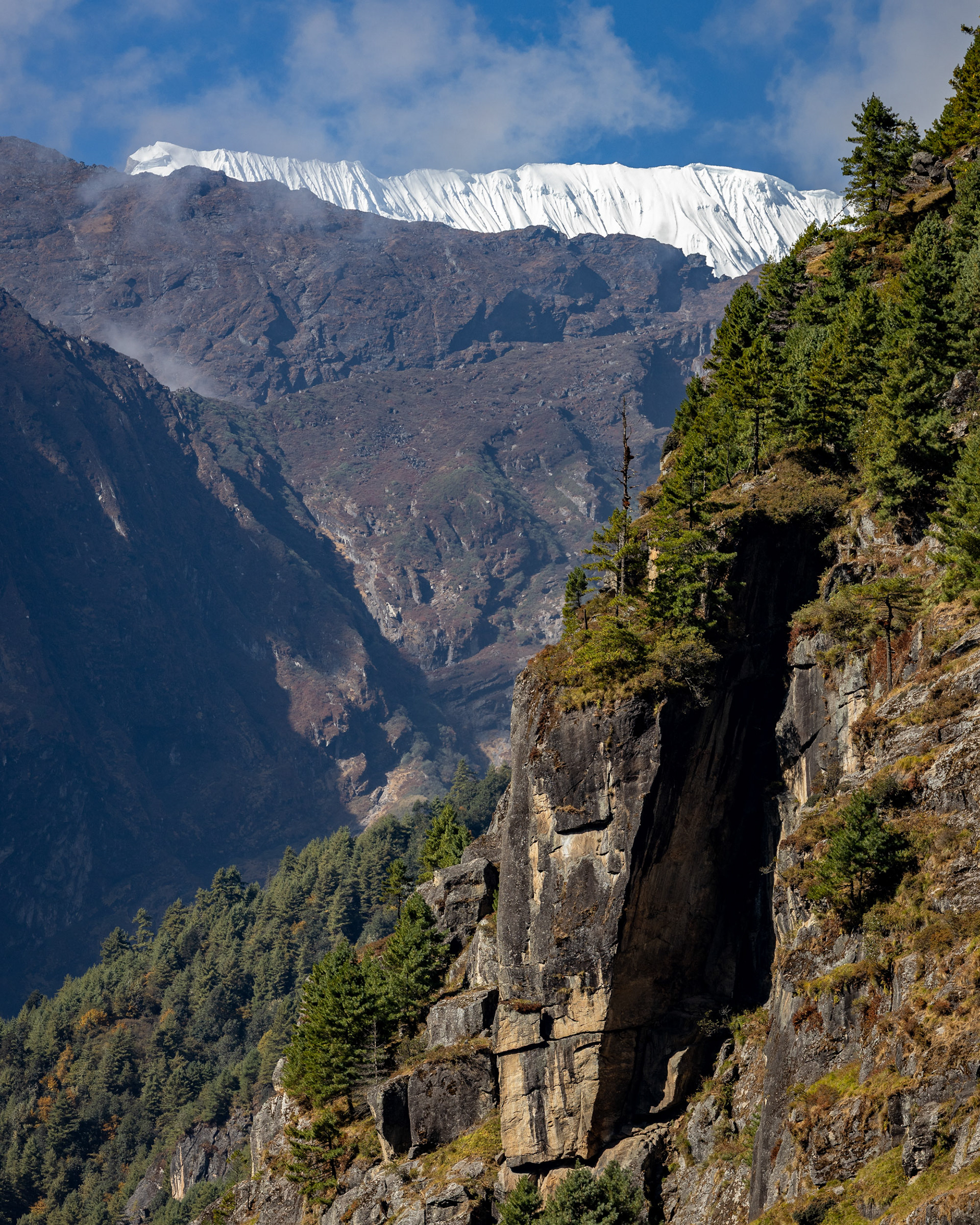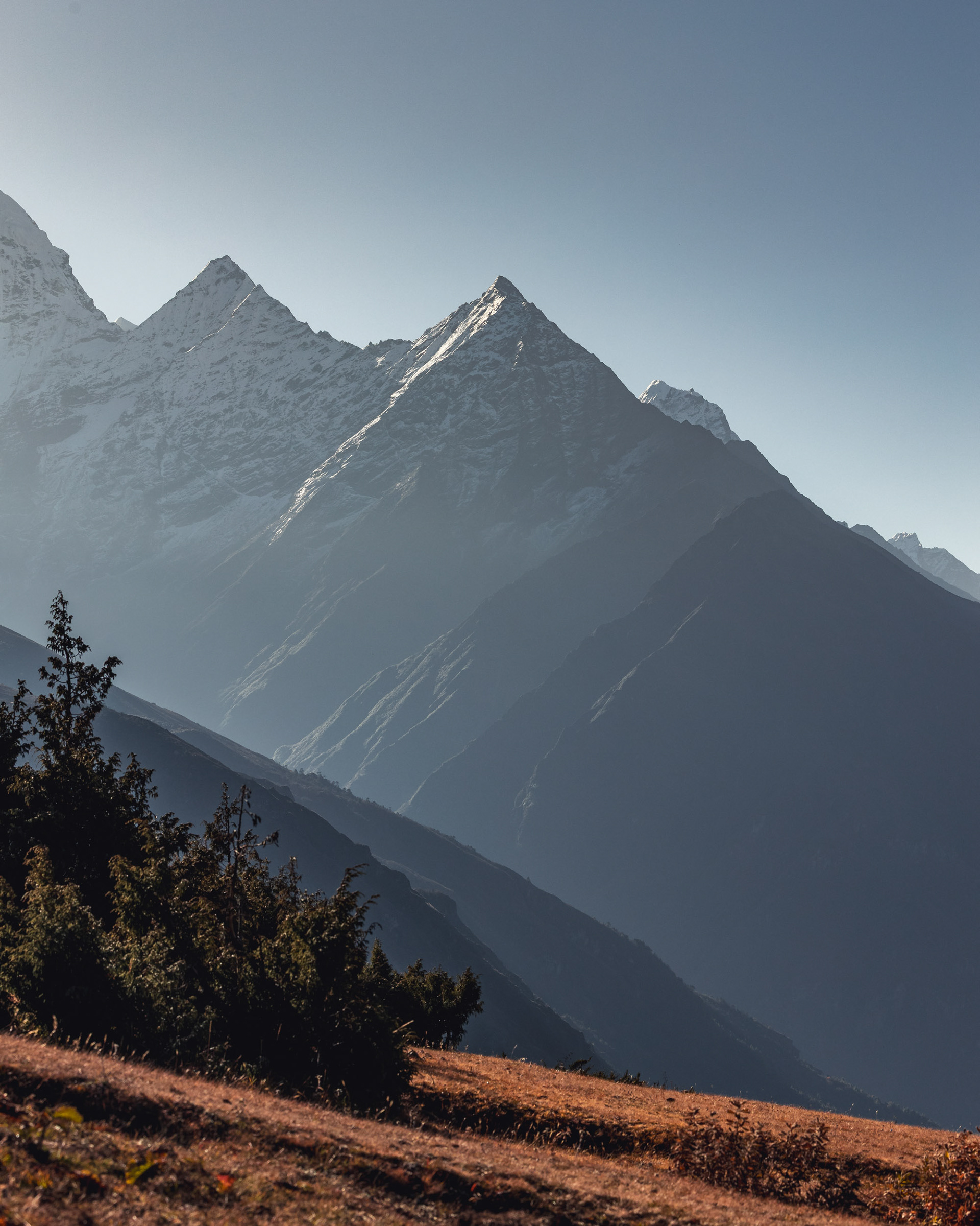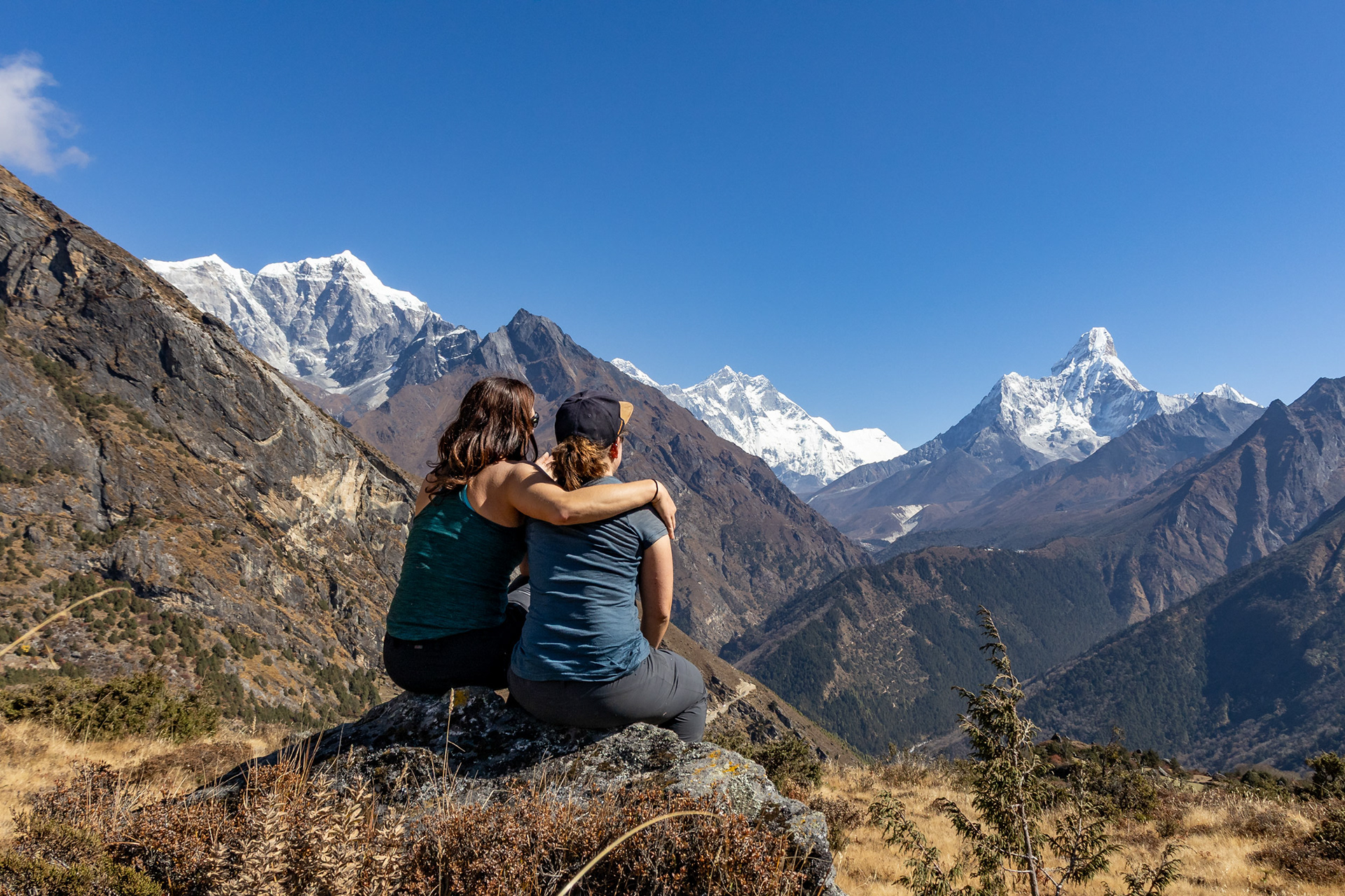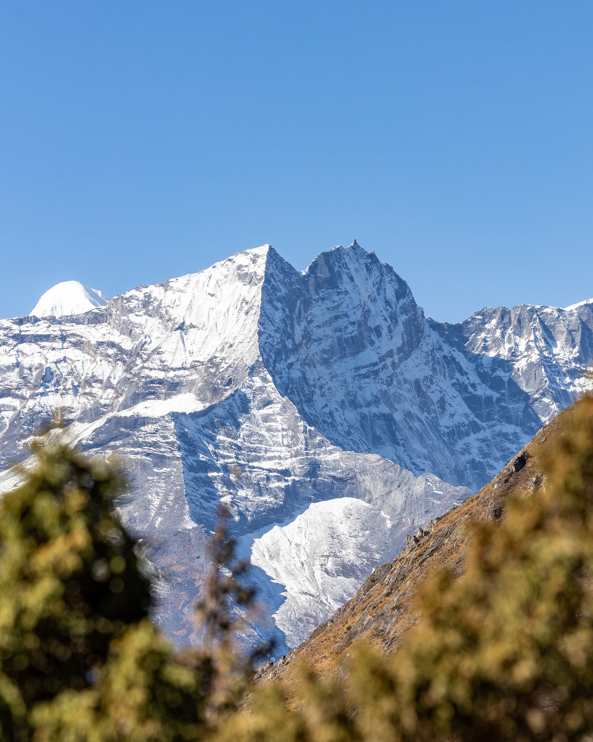 Iniitiert wurde die Reise durch meine Cousine Angela, Mitglied der Alpinpolizei und Bergrettung. Ganz spontan und abenteuerlustig schloss sich noch Kollegin Hannah unserem Trek an – eine in Kathmandu tätige Ärztin aus Dornbirn, die wir erst eine Woche vor der Tour kennenlernten. Aller guten Dinge sind drei und so nahm das Projekt im Oktober 2024 finale Gestalt an. Für uns alle stellten die Berge schon immer eine zweite Heimat dar. Es ist zumindest für mich die erste Berg(hoch)tour dieser Art und während sich Angela Steigeisen usw. schon länger gewohnt ist, rätsle ich, wie ich das Gewicht meiner Kamera samt Objektiven auf 6000 Metern herumschleppe. Glücklicherweise war das Wetter während des gesamten Treks fast schon frühlingshaft, die meisten Meter konnten ärmellos im Tanktop zurückgelegt werden.