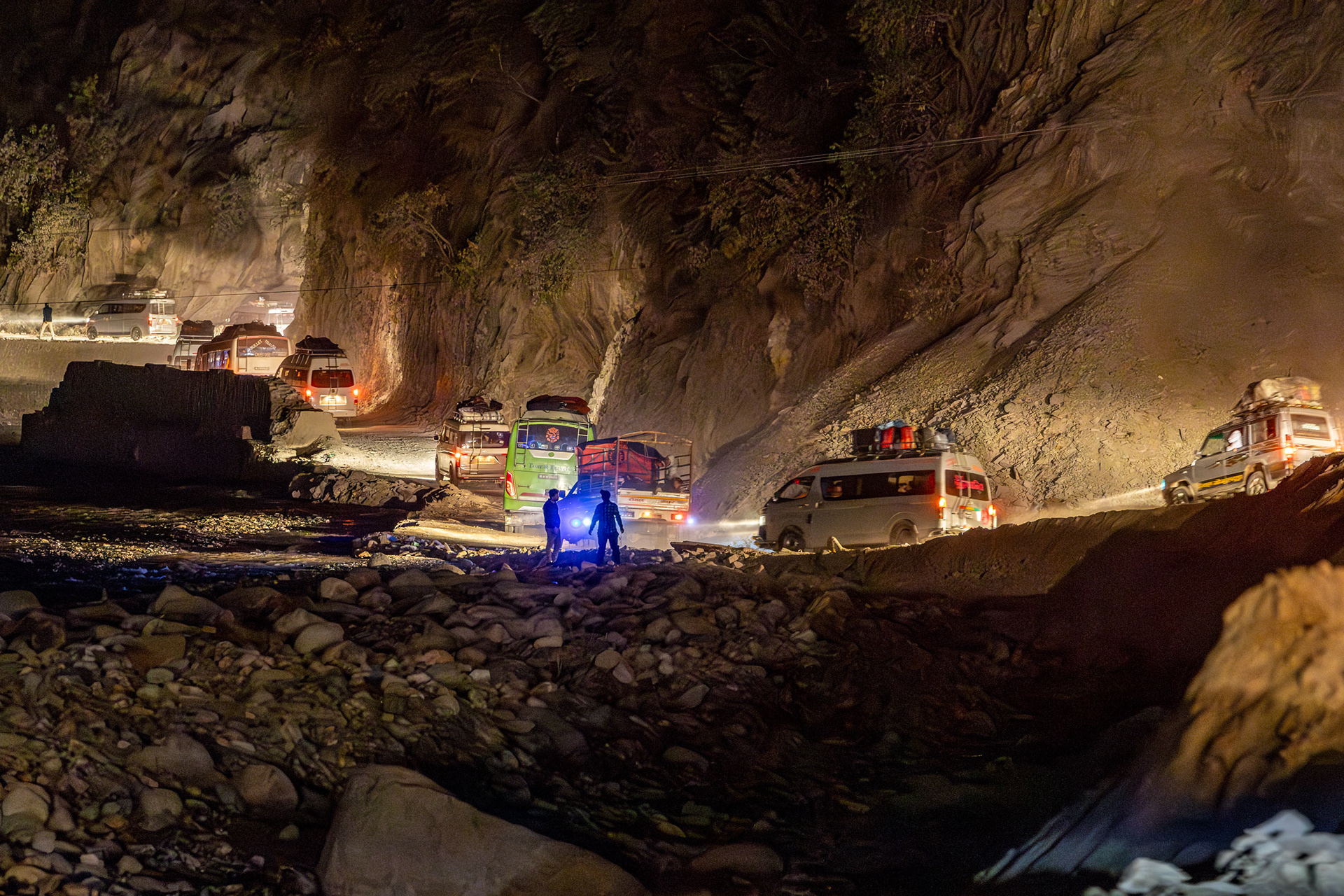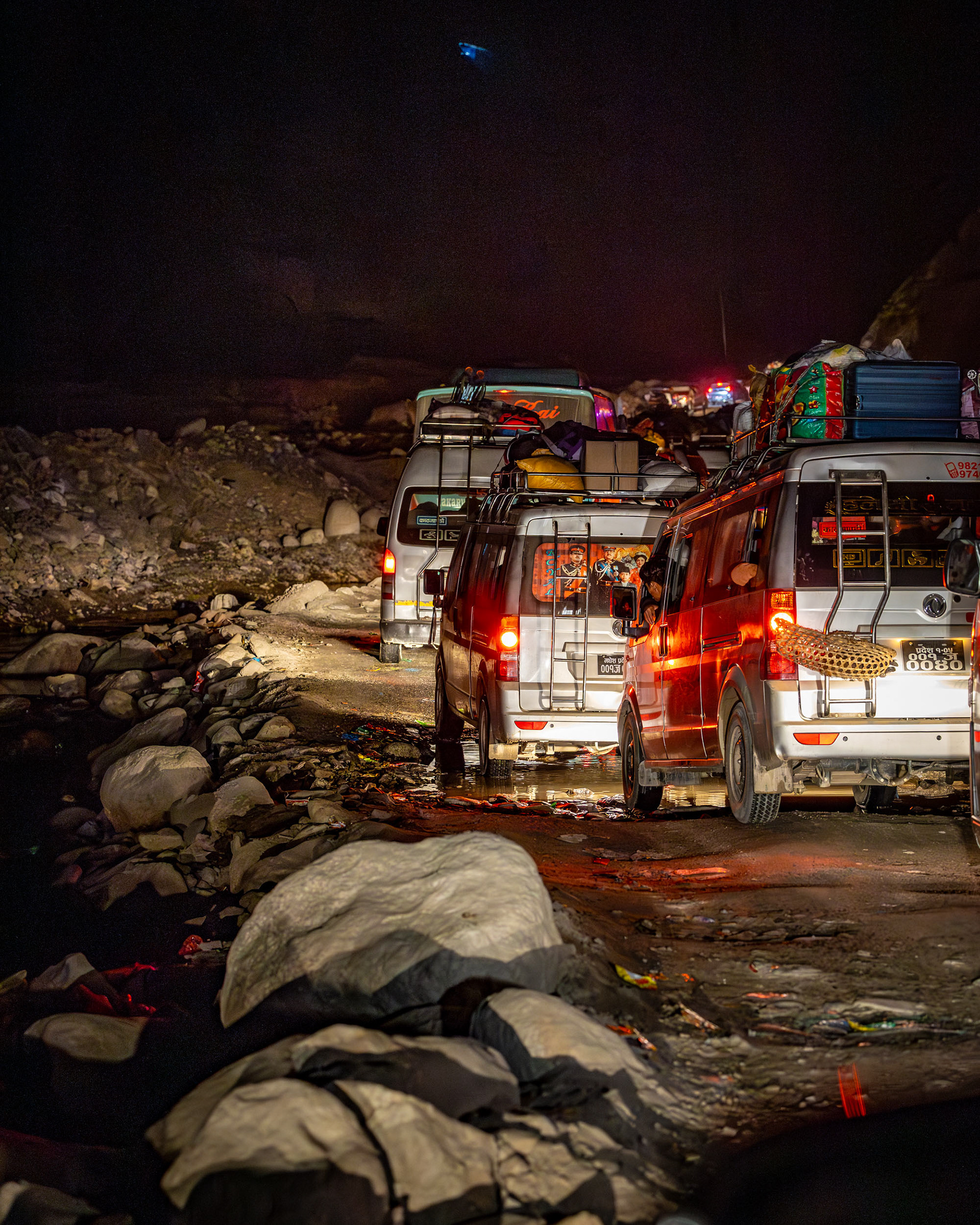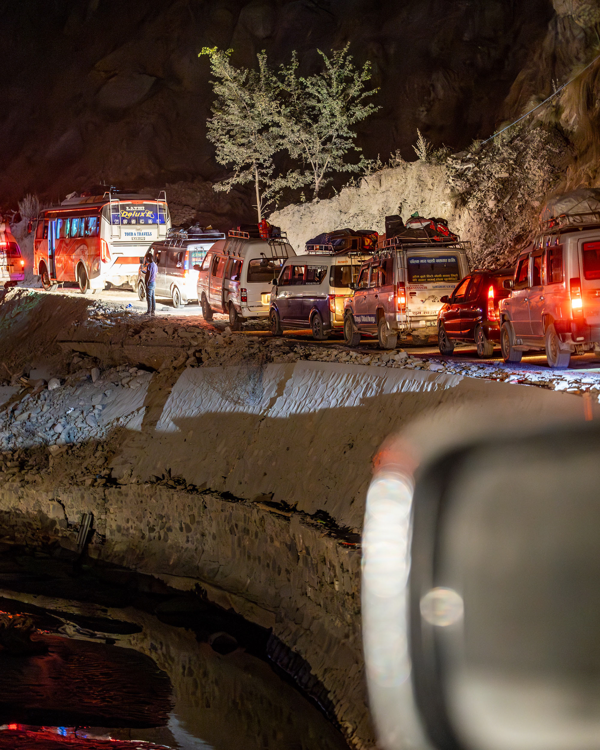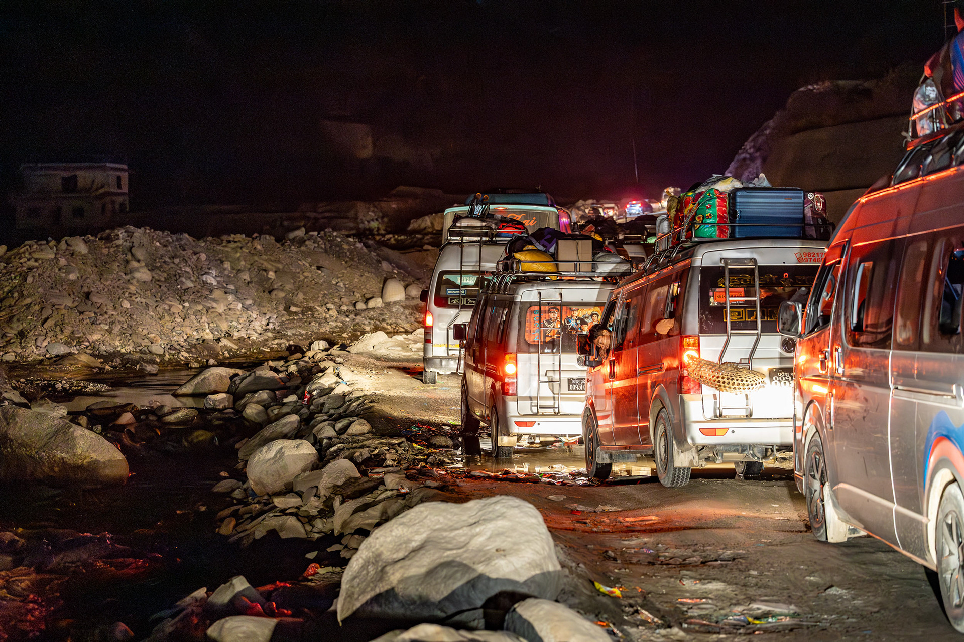 Geduld, Zeit und Vertrauen - das sind die Tugenden, um in Nepal von der einen Stadt in die nächste zu gelangen. In den bergigen Regionen Nepals ist die Straßeninfrastuktur oft temporär und in ständiger Gefahr, von Fluten und Erdrutschen weggespült zu werden. So erleben wir die Folgen der Zersörung der Flurkatastrophe im Sommer 2024 hautnah: unsere Jeepfahrt zurück nach Kathmandu führt durch Flussbette und weggespülte Dörfer und dauert 11 Stunden im Schneckentempo.