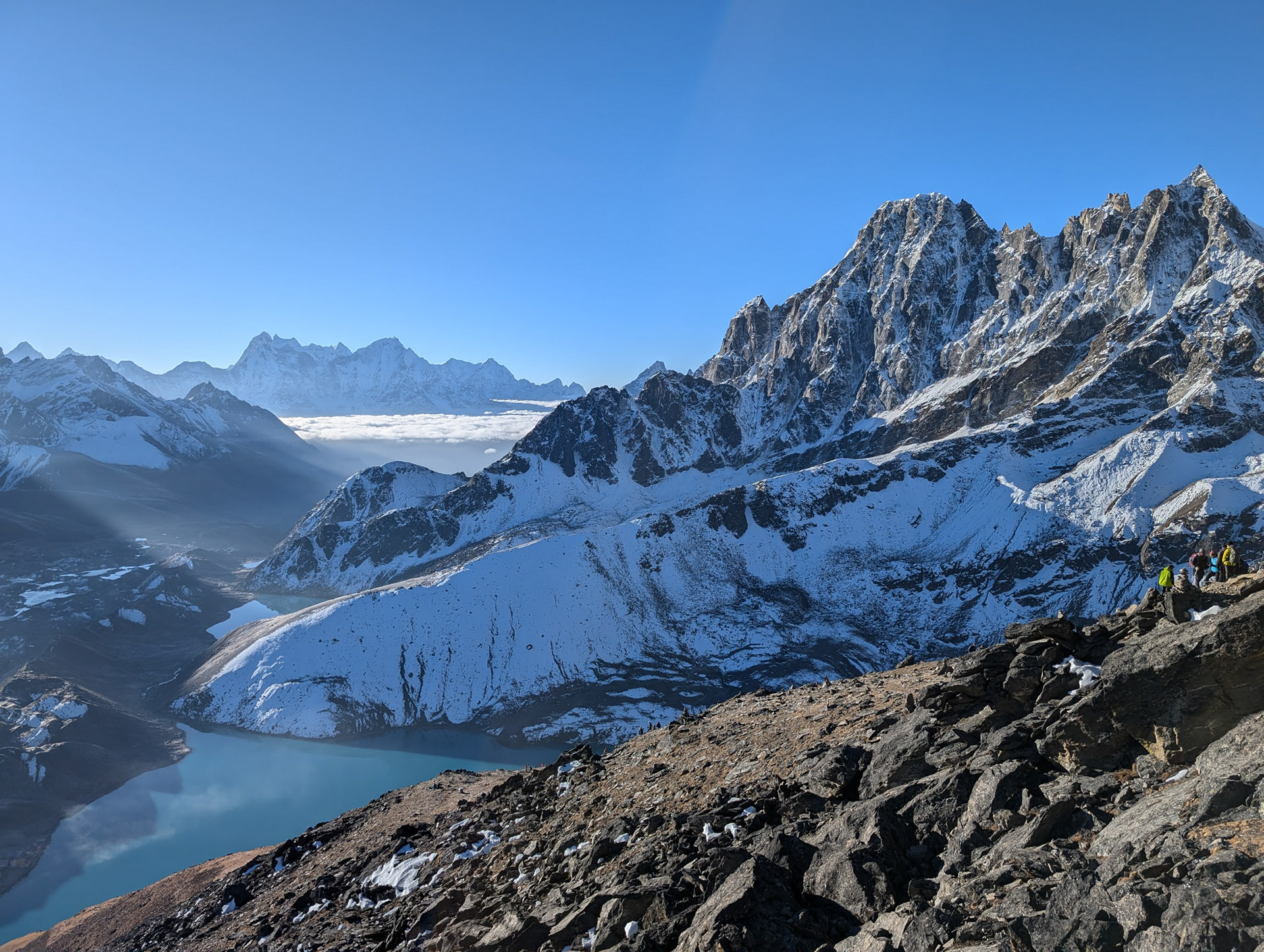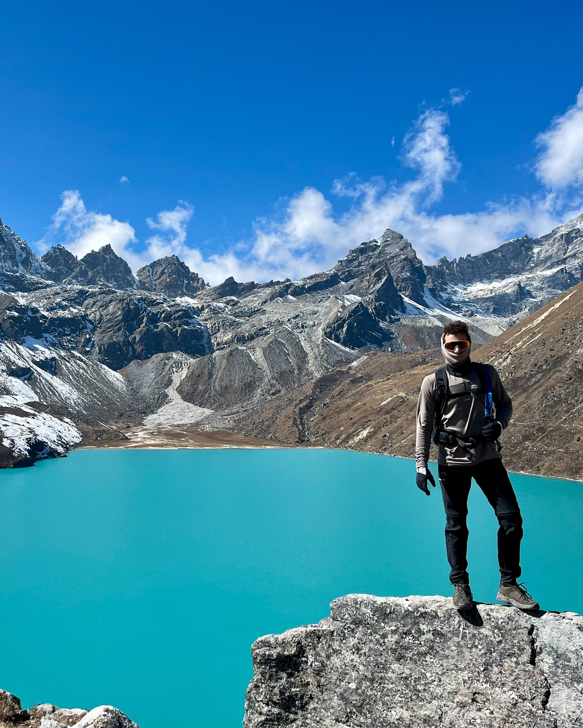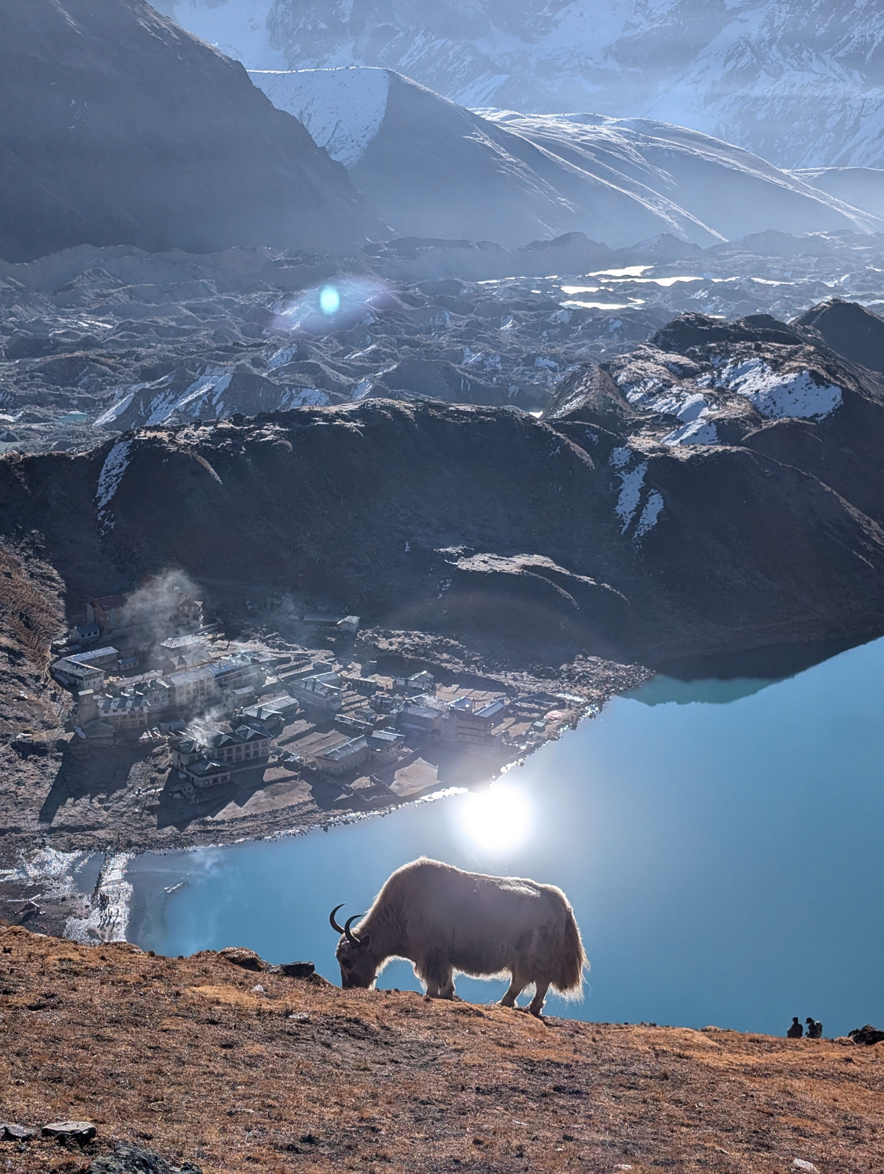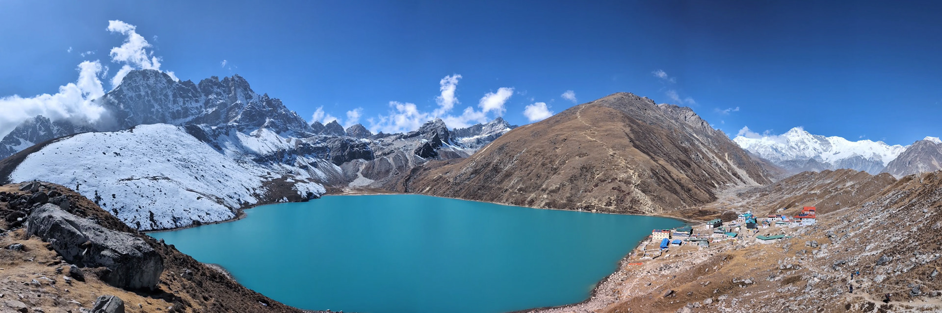 Nach zwei Tagen erreichen wir die Siedlung Gokyo, die am größten Eisstrom Nepals liegt. Um uns zu akklimatisieren, besteigen wir den benachbarten Gokyo Ri, der erste Fünftausender mit 5357m, von dem aus fünf Achttausender im Gipfelpanorama sichtbar sind. Es wird spannend: bald folgt die Überquerung des längsten Gletschers des Himalaya und des Cho La Passes mit 5420m.