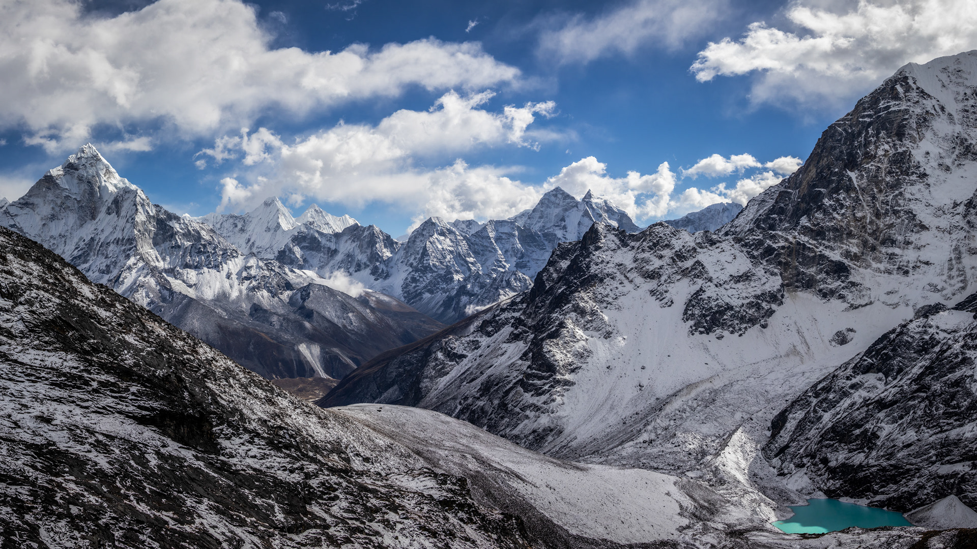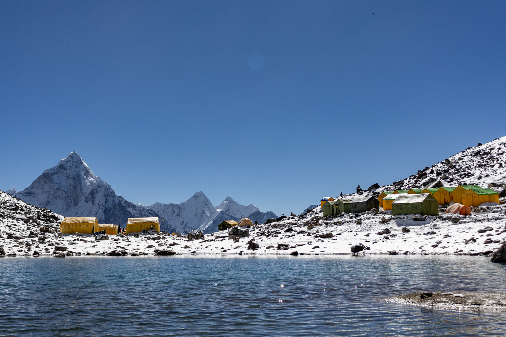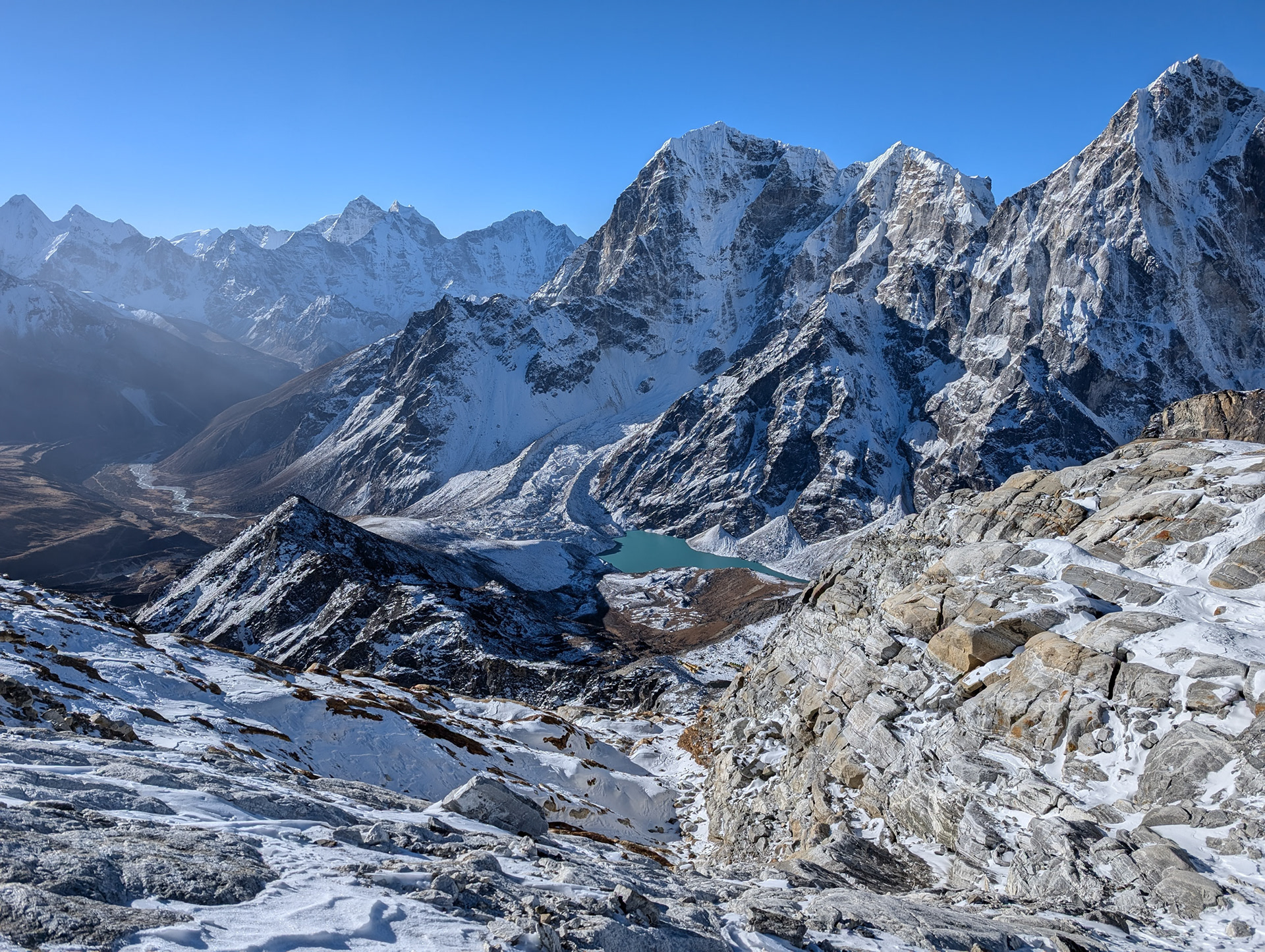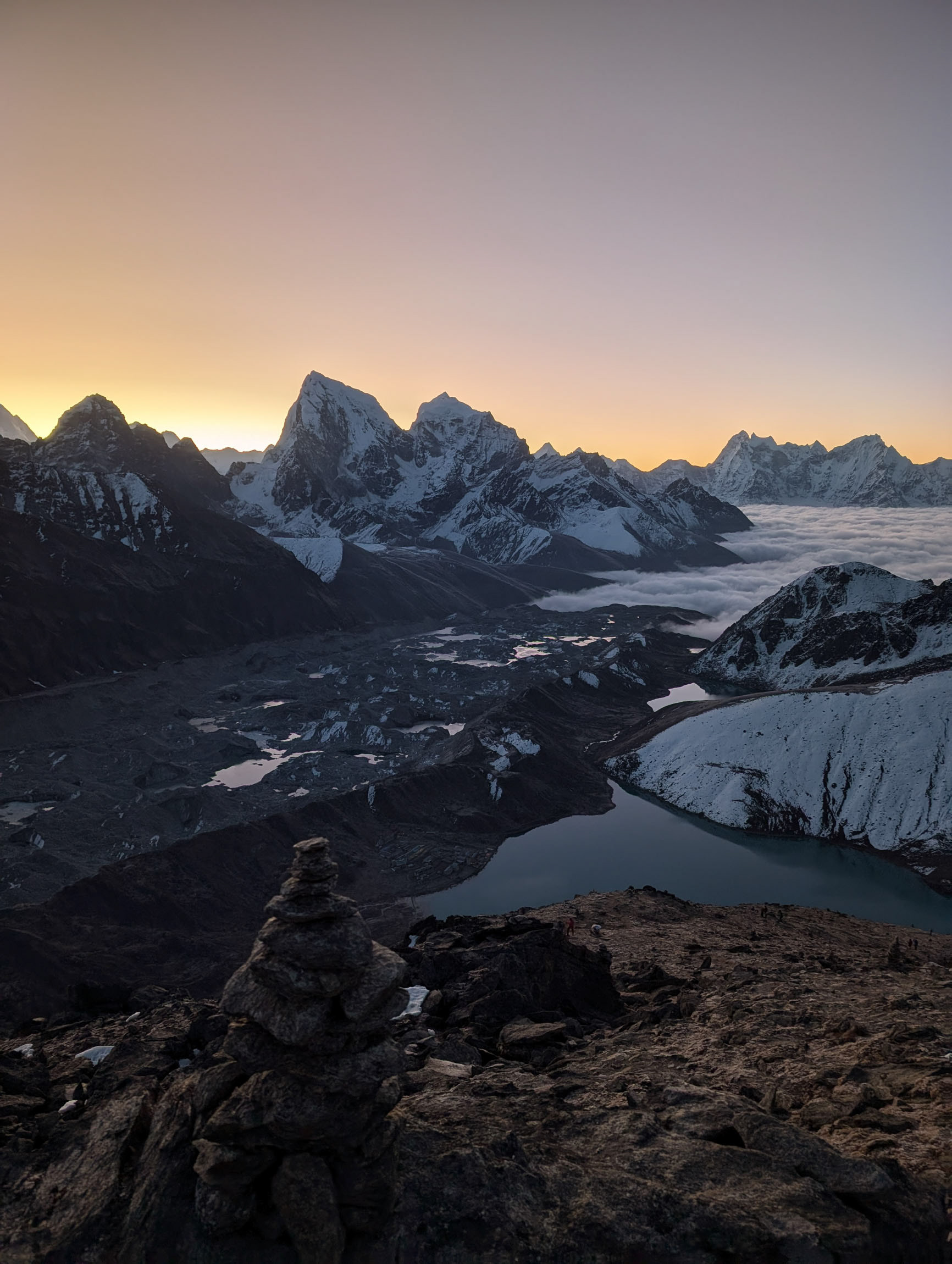 Nach zwei Tagen erreichen wir die Siedlung Gokyo, die am größten Eisstrom Nepals liegt. Um uns zu akklimatisieren, besteigen wir den benachbarten Gokyo Ri, der erste Fünftausender mit 5357m, von dem aus fünf Achttausender im Gipfelpanorama sichtbar sind. Es wird spannend: bald folgt die Überquerung des längsten Gletschers des Himalaya und des Cho La Passes mit 5420m.