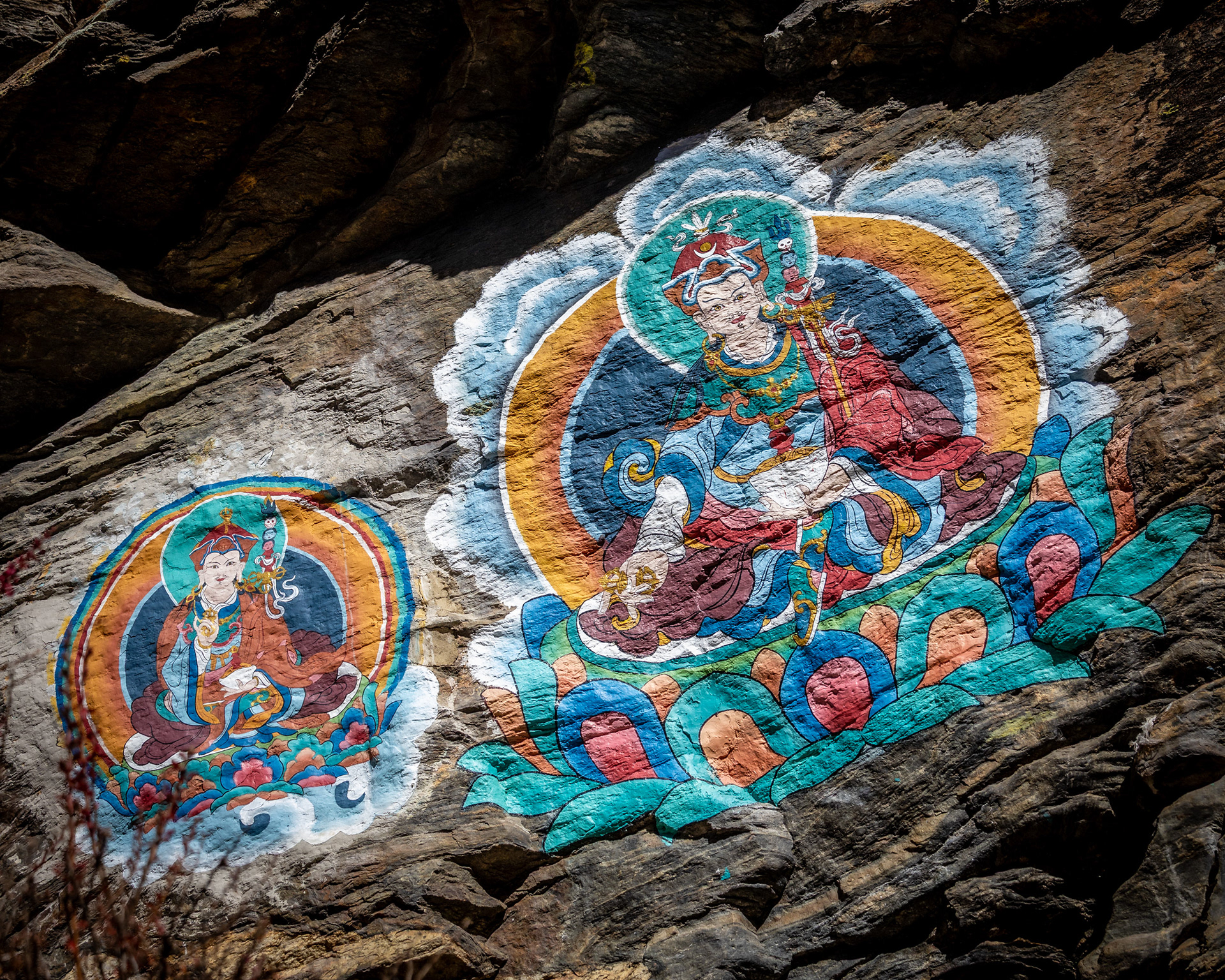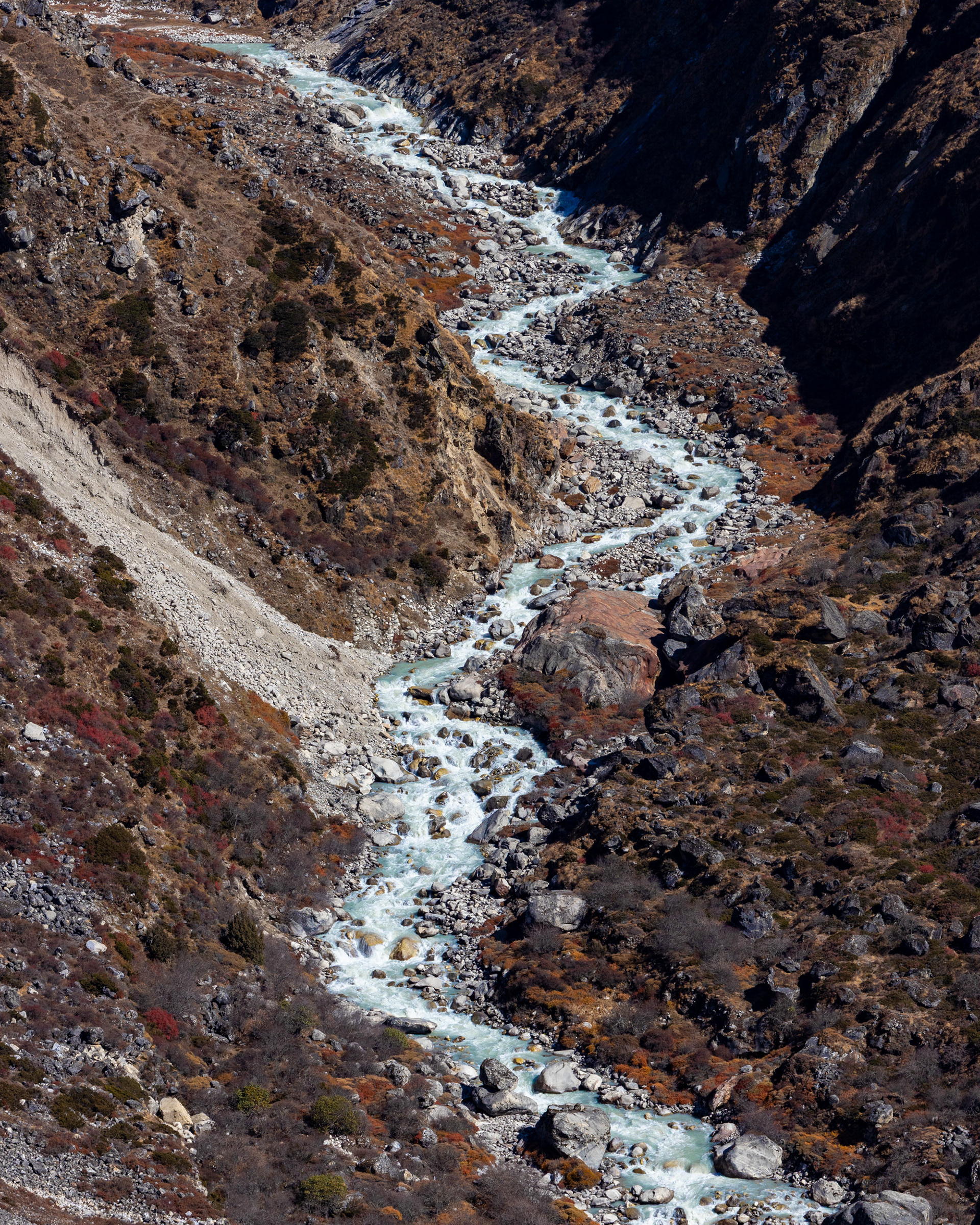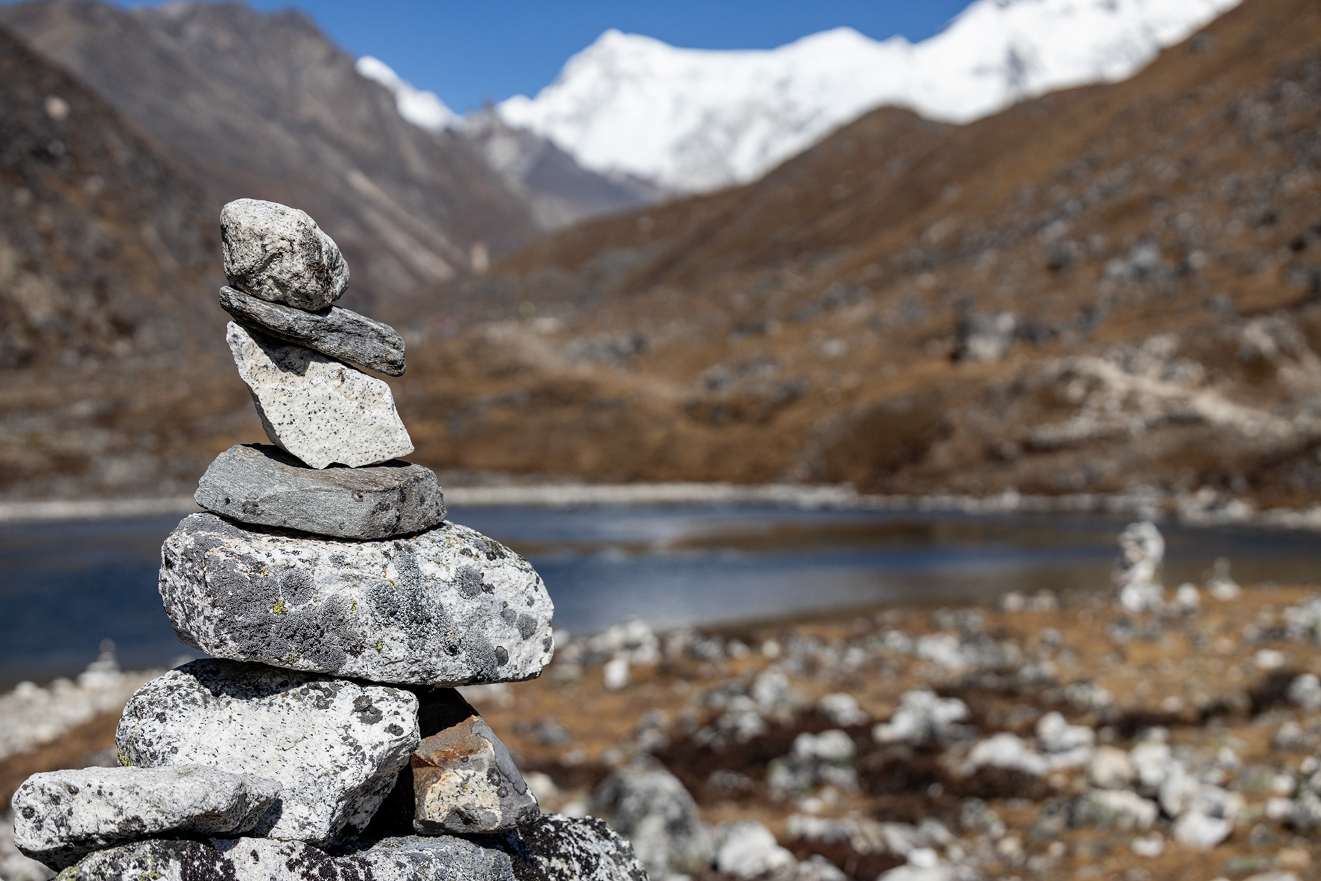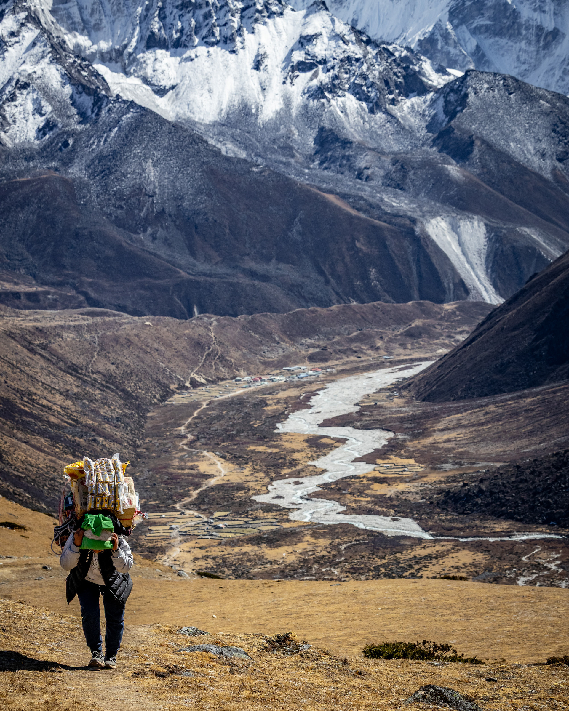 Die Achttausender sind bald schon zum Greifen nah. Wir wandern durch bunte Hügellandschaften, bestückt mit monumentalen Felsbrocken, türkisblaue Wildbäche fressen sich durch ockerbraune Täler. Die Farbpalette reicht von goldbraun, rubin bis eisblau, die Gerüche sind vielfältig und erinnern an einen orientalischen Gewürzmarkt. Unser Sherpaträger zeigt sich gelassen und motivierend zugleich.