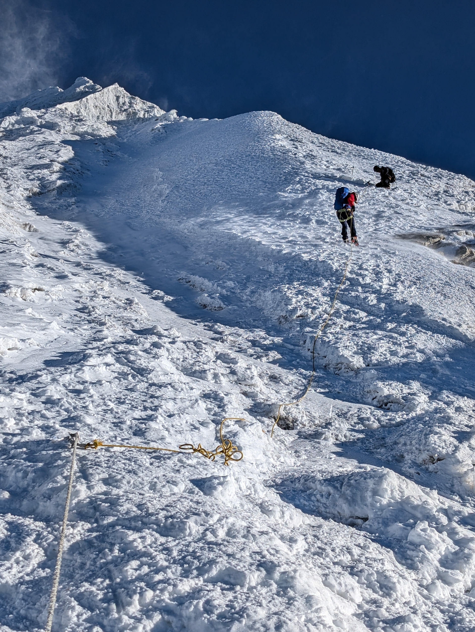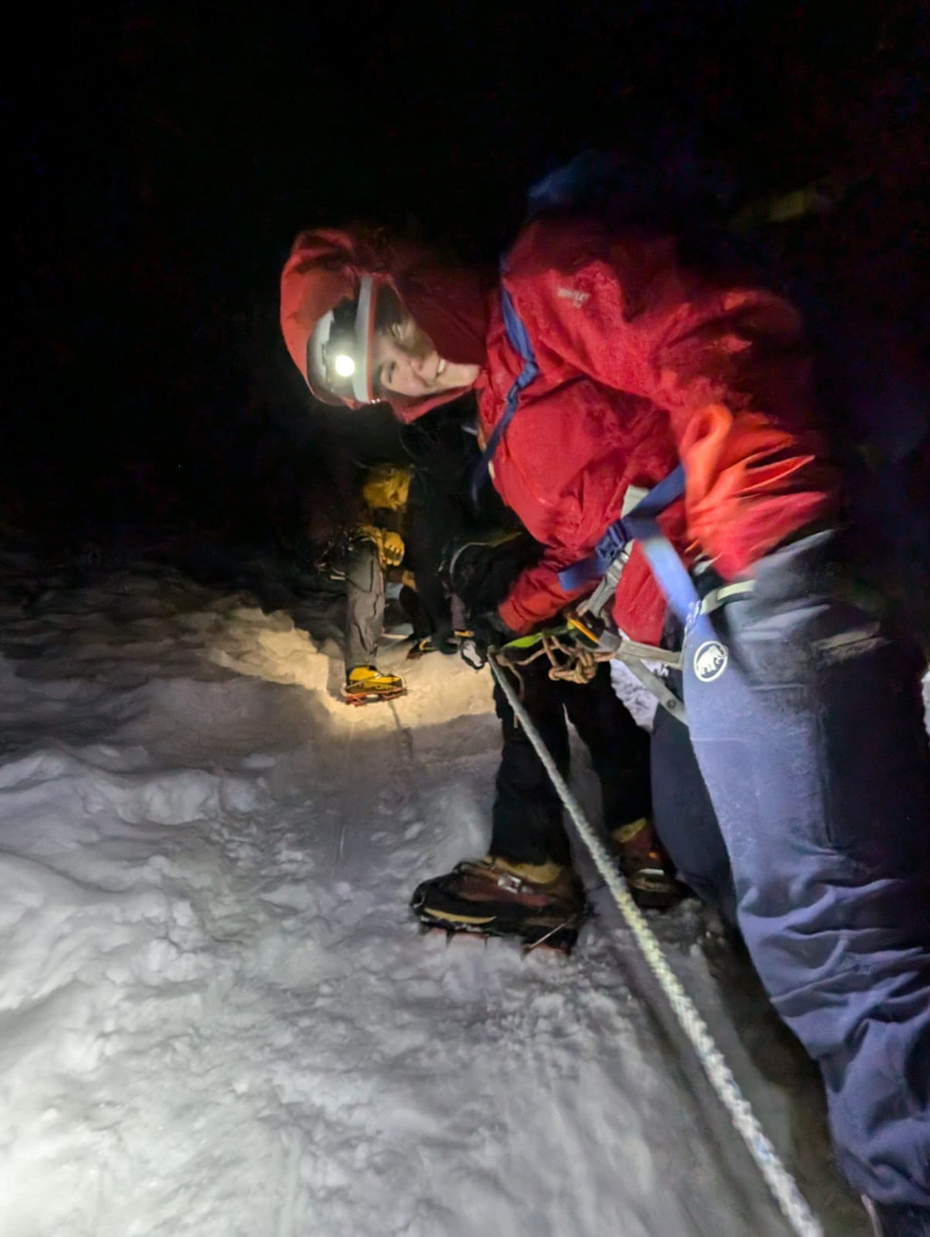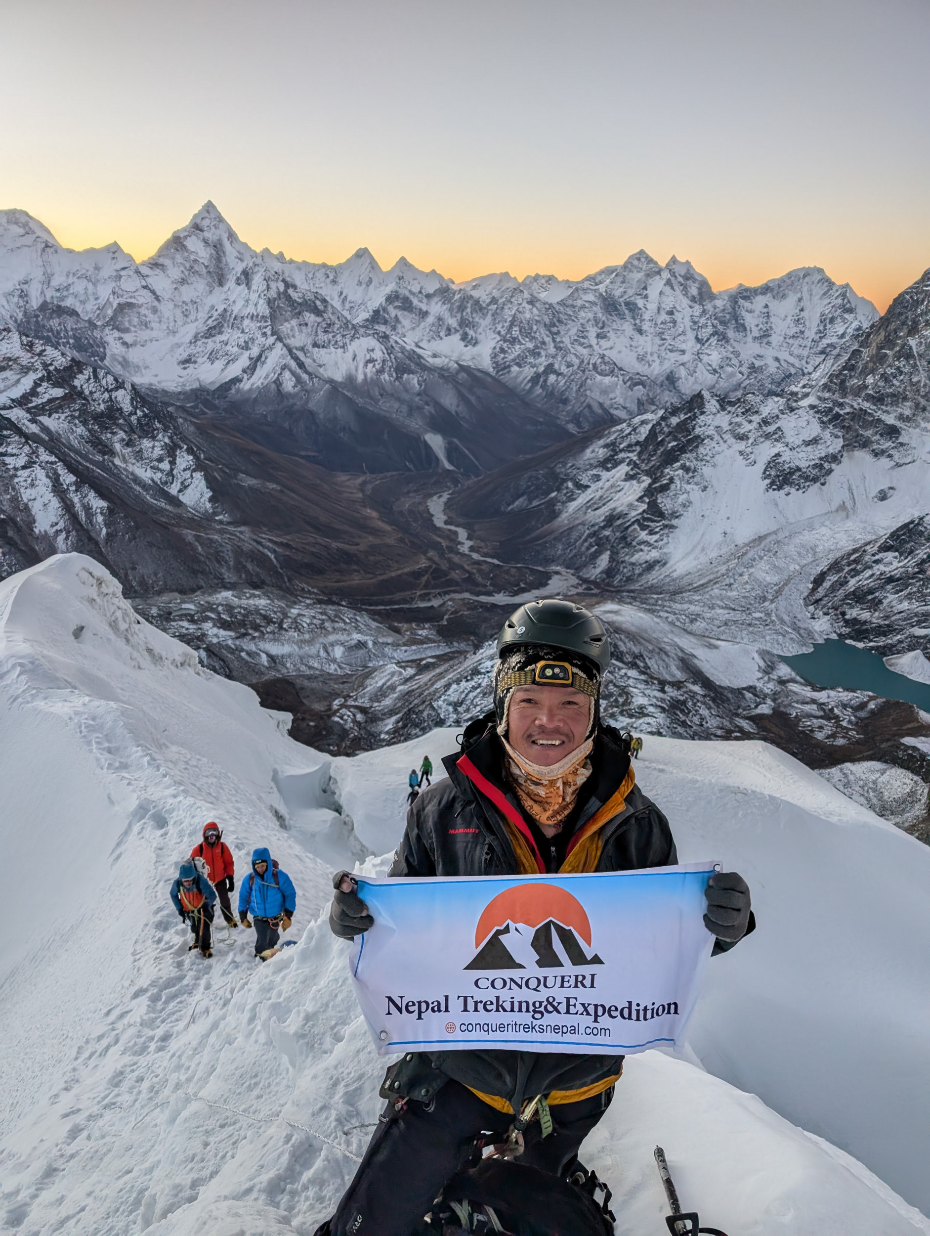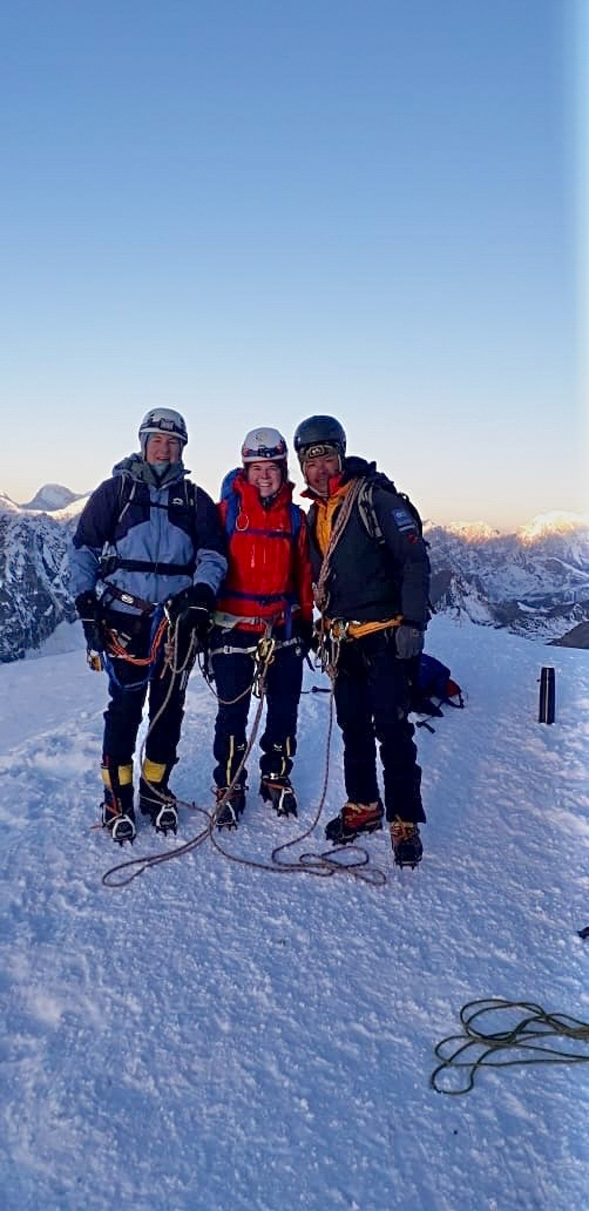 Meine Cousine Angela und Kollegin Hannah besteigen den Lobuche East (6119m) zusammen mit High-Altitude-Guide Pasang Sherpa am 7.11.2024 noch vor Sonnenaufgang. Glückwunsch!