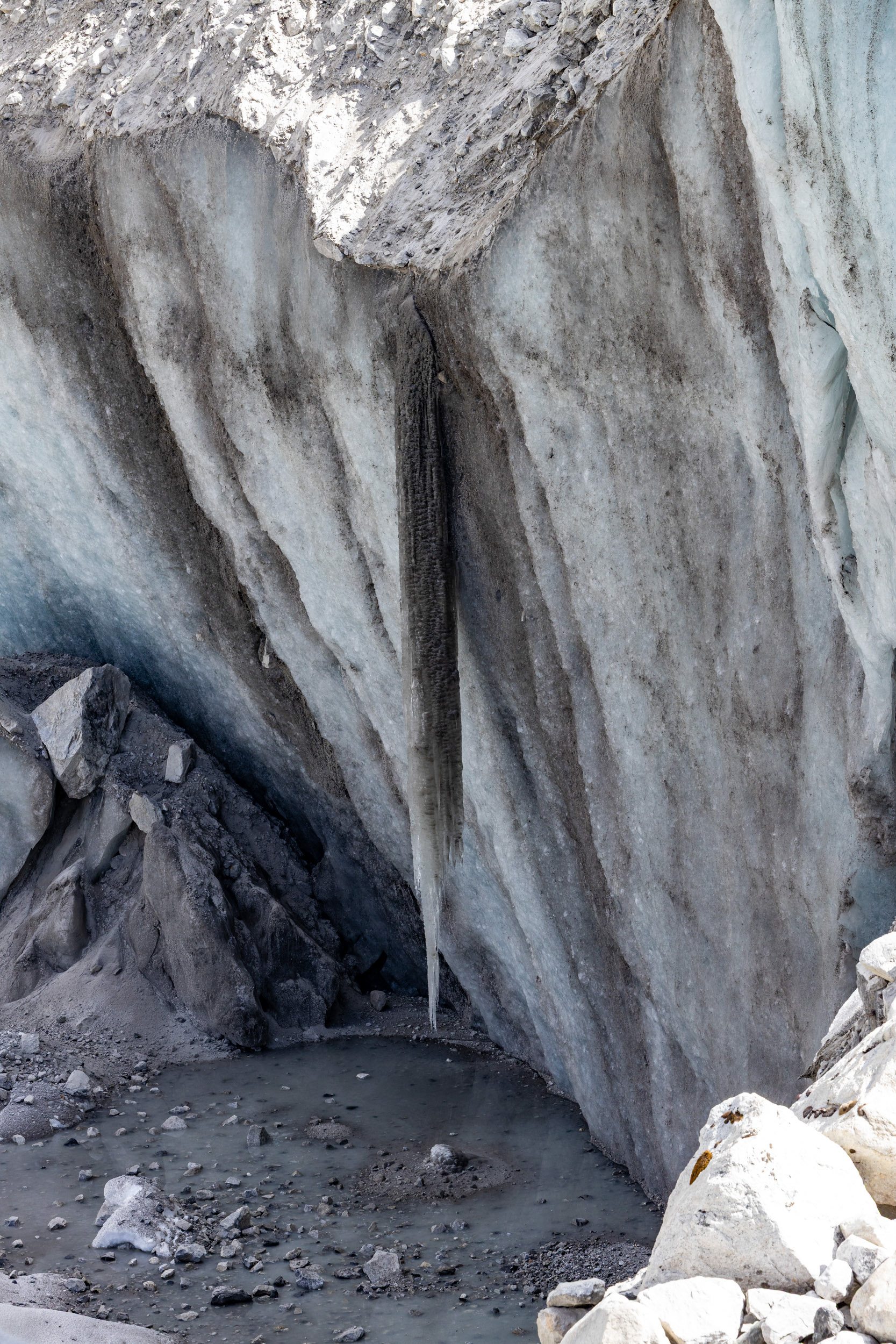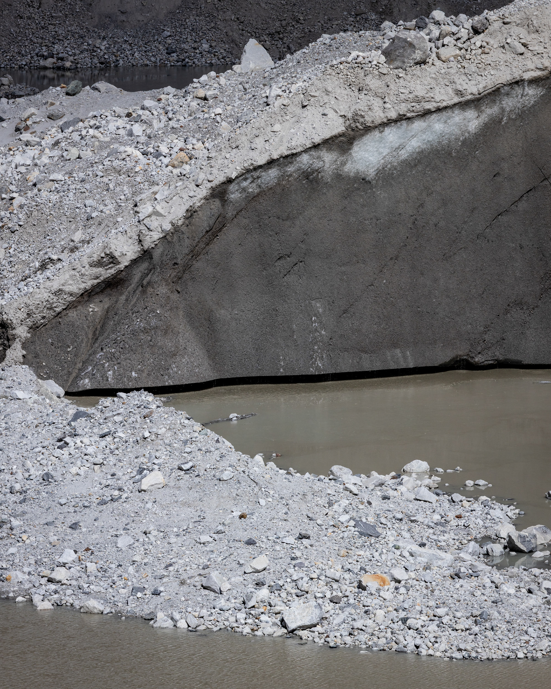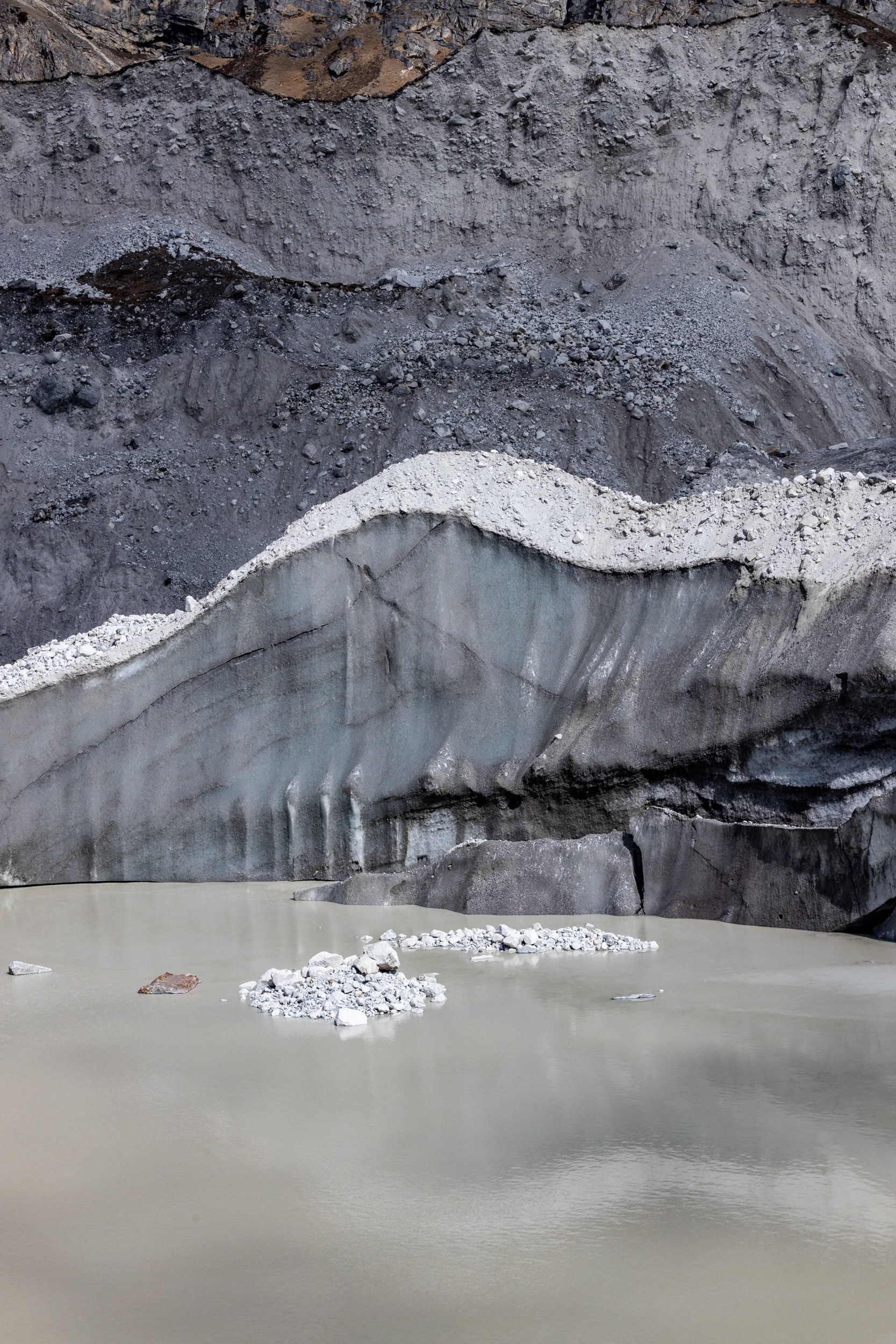 Toteis und Geröll dominieren die Landschaft und die Gletscherzunge scheint hier das einzige "Lebewesen" weit und breit zu sein. Auch wenn Farbigkeit bis auf das selten funkelnde Türkis des Eises ausbleiben, findet sich in der Kargheit eine gewisse Ästhetik wieder. Manchmal drücke ich den Auslöser der Kamera schon garnicht mehr, weil ich eine Szene lieber wahrnehme und einer Eisscholle beim Hinunterbrechen zuschaue - ein kurzer Moment der Lebendigkeit. Wovon sich wohl der kleine Schmetterling, der sich auf unserer mitgebrachten Vorarlberger Hirschsalami niedersetzt, ansonsten ernährt? Ein Geier verdunkelt kurz die erbarmungslos herunterbrennenden Sonnenstrahlen und ich frage mich, auf wen oder was er es wohl am meisten abgesehen hat...