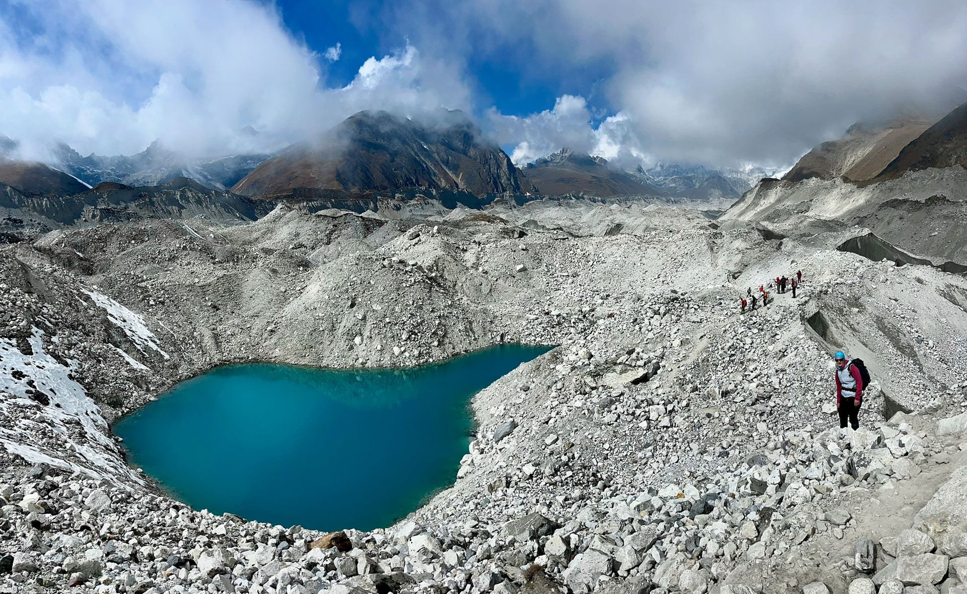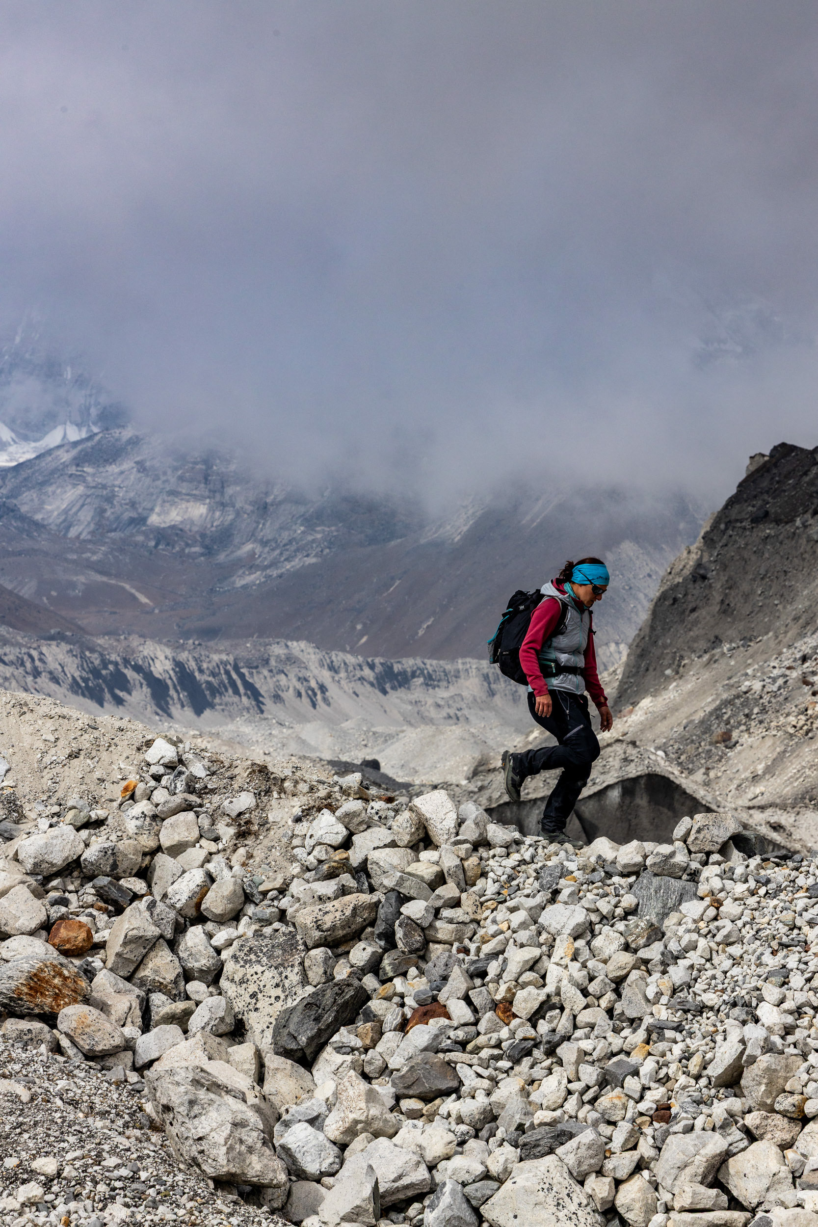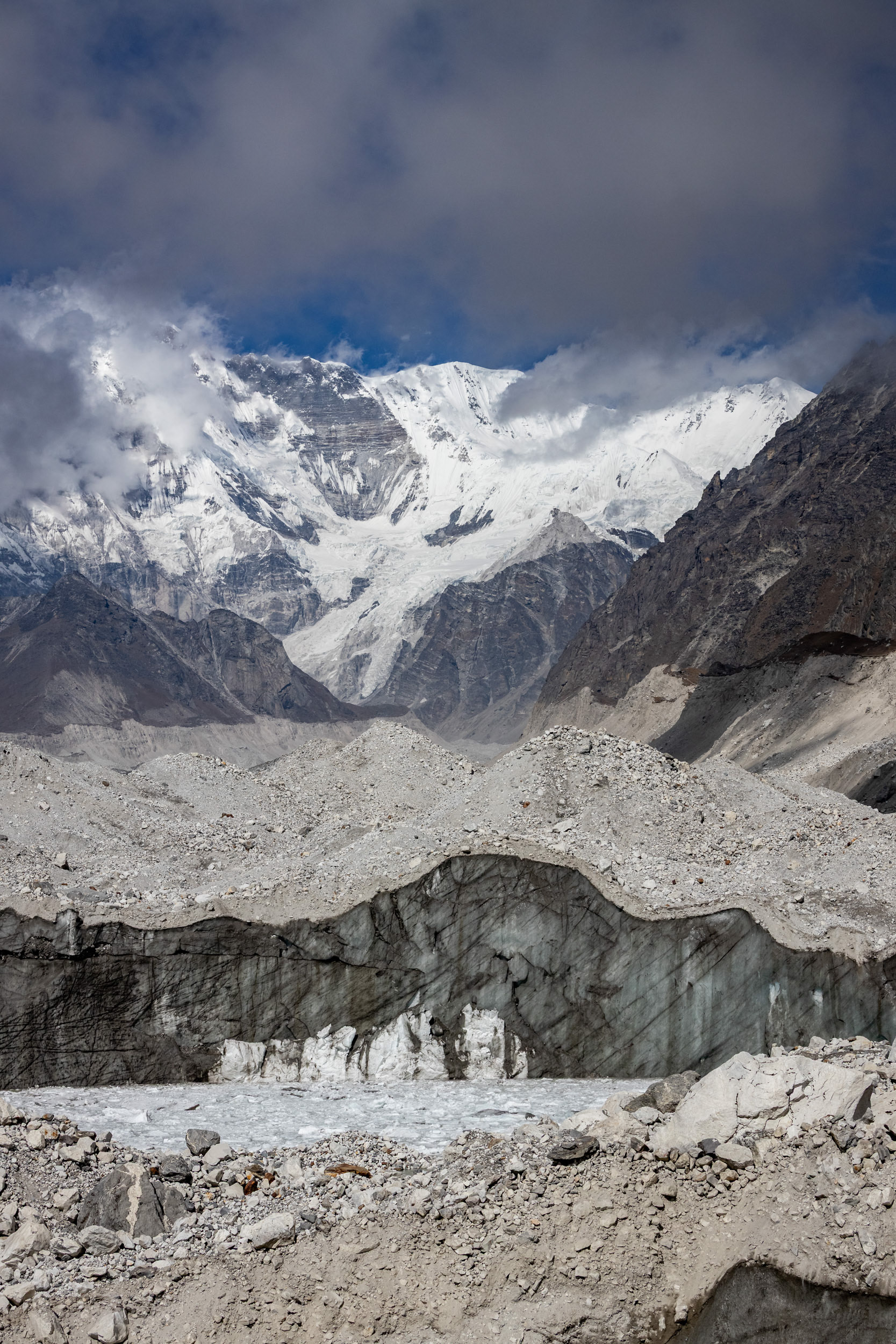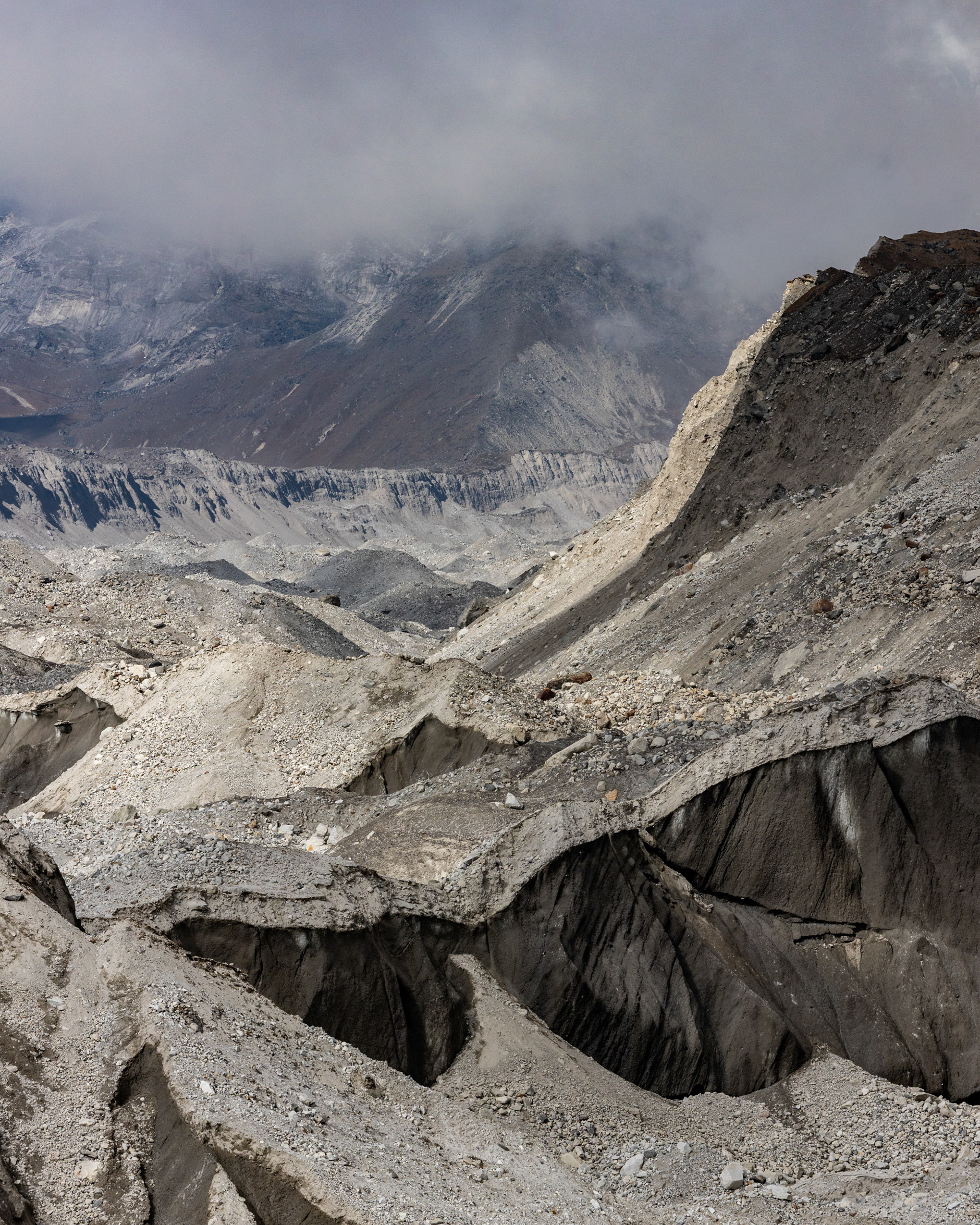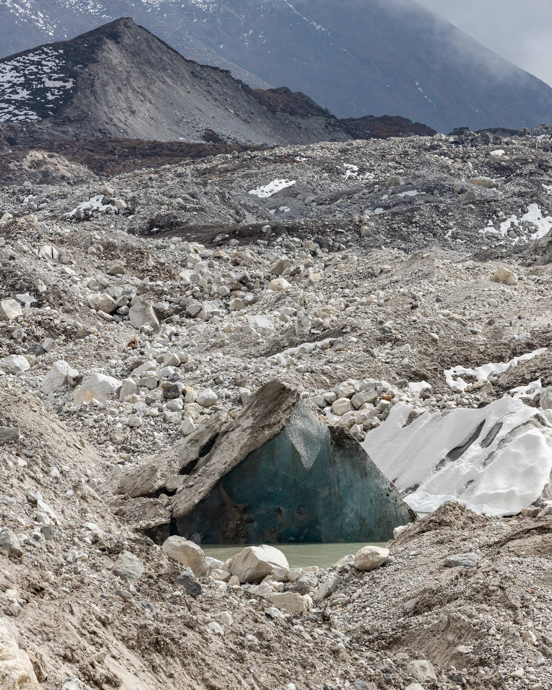 Vom letzten halbwegs zivilisierten Ort Gokyo marschierend, kreuzen wir den längsten Gletscher des Himalaya (36km), der unter dem sechsthöchsten Gipfel der Welt "Cho Oyu" (8188m) entspringt. Der Weg darüber verändert sich von Jahr zu Jahr. Von oben betrachtet ist das Eisgeschiebe deutlich zu erkennen, mittendrinn stehend glaubt man, am leblosesten Ort jemals zu sein.