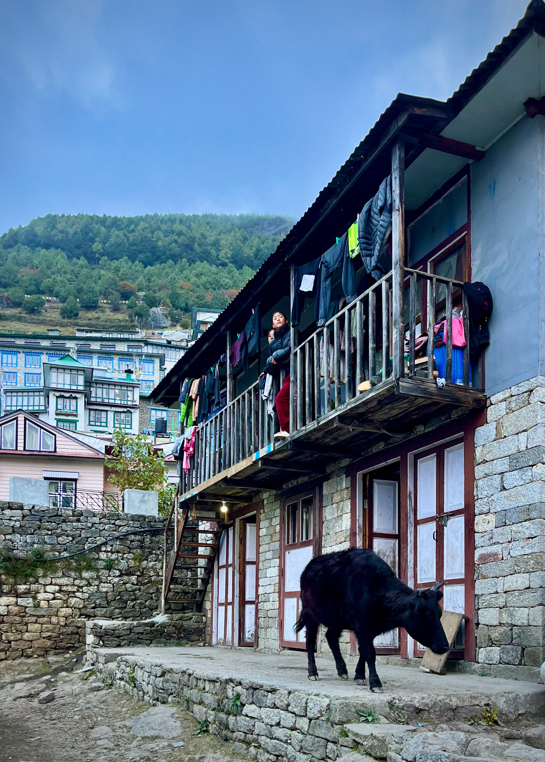 In Khumjung, das sich auf 3790m auf einer weiten Ebene einnistet, erfahren wir das Dorfleben nicht wie bisher im Vorbeigehen, sondern noch authentischer, fast zum schmunzeln: die Hausmauern werden mit den Fäkalien der Yaks beklebt, um diese in der Sonne fladenförmig zu trocknen und zu Brennmaterial zu verarbeiten. Wir besuchen ein 330 Jahre altes Kloster, das angeblich den Schädel DES Yeti beherbergt und setzen den Weg fort, vorbei an Stupas und grasenden Yaks...