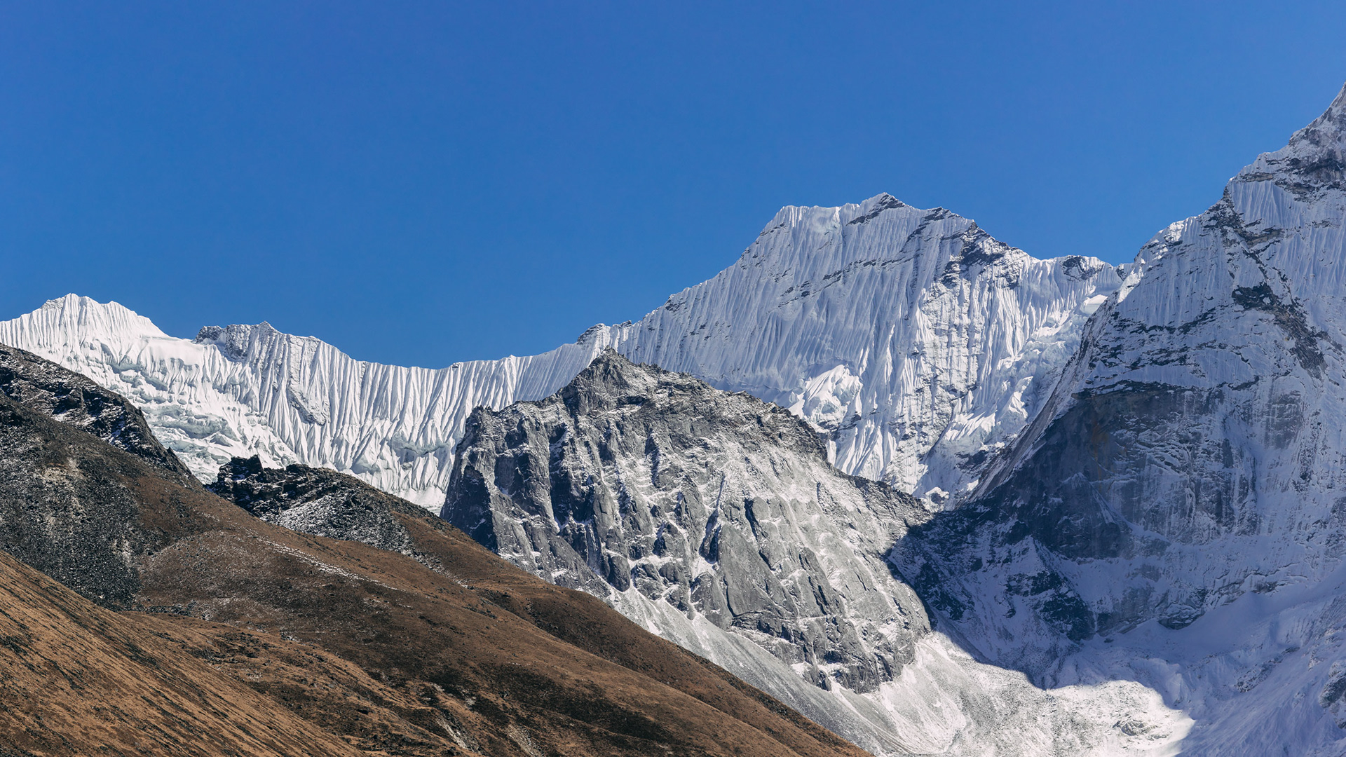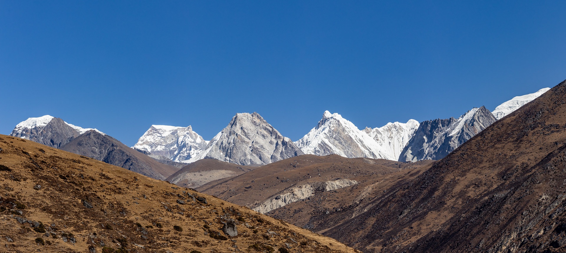 Während sich ständig surreale Eindrücke in meine Netzhaut brennen, ragen langsam die Gesichter der ersten 8000er hinter der goldbraunen Hügellandschaft hervor. Es ist fast beschämend, die Natur hier nur mit Worten zu beschreiben, auch meine Fotos können die Eindrücke niemals widerspiegeln. Die tief schnee- und eisbedeckten Berge bilden den Horizont in ungewohnter Höhe, das Hinaufstarren führt fast zu Nackenschmerzen, doch das nehme ich gerne in Kauf. Nach unten reichen die Täler und Schluchten genau so weit in furchterregende Tiefen.