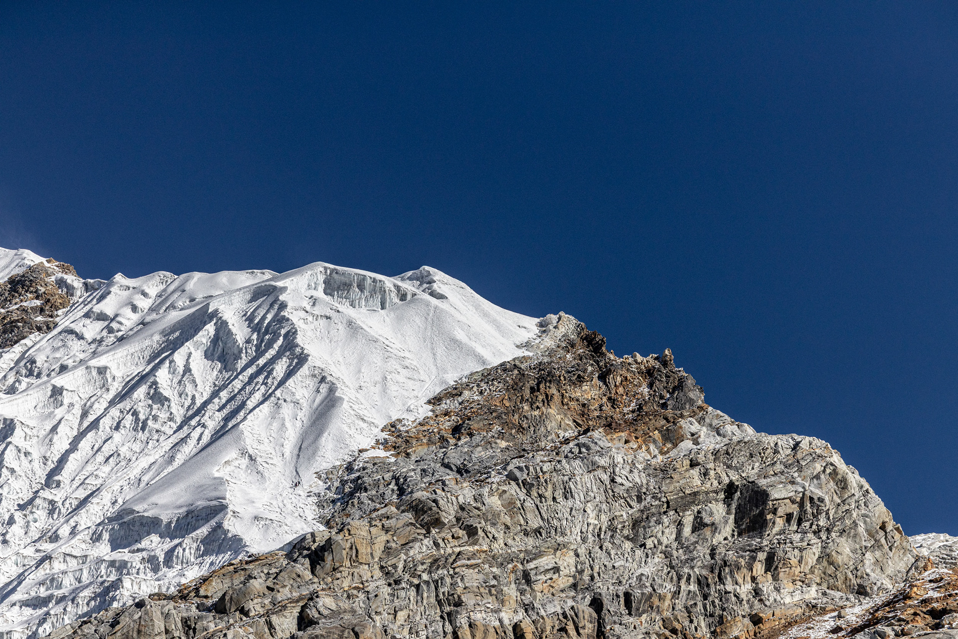 Die karge Felslandschaft ist im Detail wunderschön. Ein Steinchen scheint exotischer als das andere zu sein und ich würde am liebsten einige als Souvenir einstecken. Doch daran ist nicht zu denken, leider hat mir leichtes Feiber letztens zu schaffen gemacht, die Lunge keucht und Yangda Sherpa hilft mir sogar, den Rucksack mit meinem Kameraequipment zu tragen. Im Tunnelblick setze ich einen Fuß vor den anderen, Raum und Zeit verschwimmen und mein einziges Ziel ist gerade nur die Passhöhe mit 5420m.